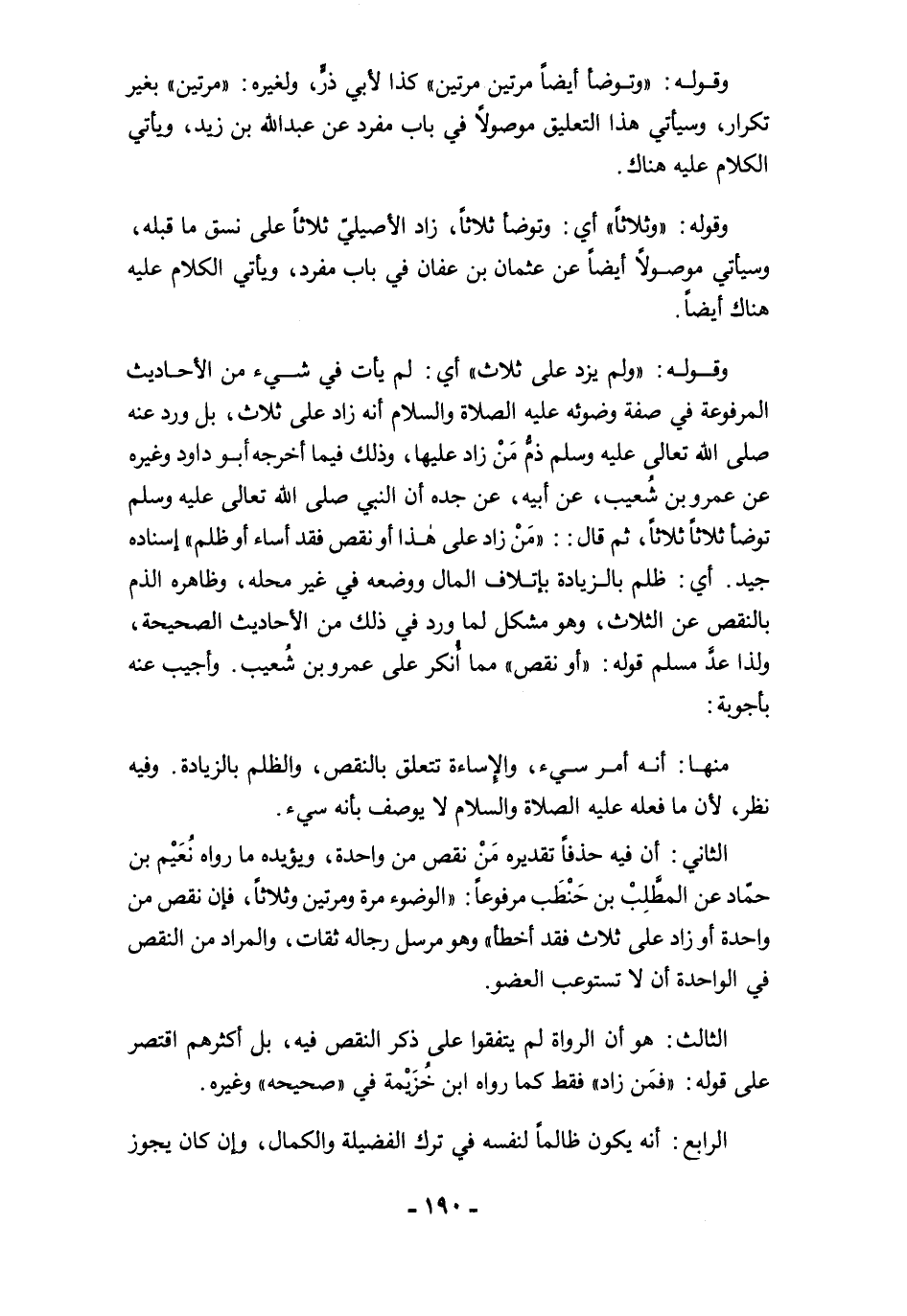 وقوله: "ولم يزد على ثلاث" أي: لم يأت في شيء من الأحاديث المرفوعة في صفة وضوئه عليه الصلاة والسلام أنه زاد على ثلاث، بل ورد عنه صلى الله تعالى عليه وسلم ذمُّ مَنْ زاد عليها، وذلك فيما أخرجه أبو داود وغيره عن عمرو بن شُعيب، عن أبيه، عن جده أن النبي صلى الله تعالى عليه وسلم توضأ ثلاثًا ثلاثًا، ثم قال: "مَنْ زاد على هذا أو نقص فقد أساء أو ظلم" إسناده جيد. أي: ظلم بالزيادة بإتلاف المال ووضعه في غير محله، وظاهره الذم بالنقص عن الثلاث، وهو مشكل لما ورد في ذلك من الأحاديث الصحيحة, ولذا عدَّ مسلم قوله: "أو نقص" مما أُنكر على عمرو بن شُعيب. وأجيب عنه بأجوبة: