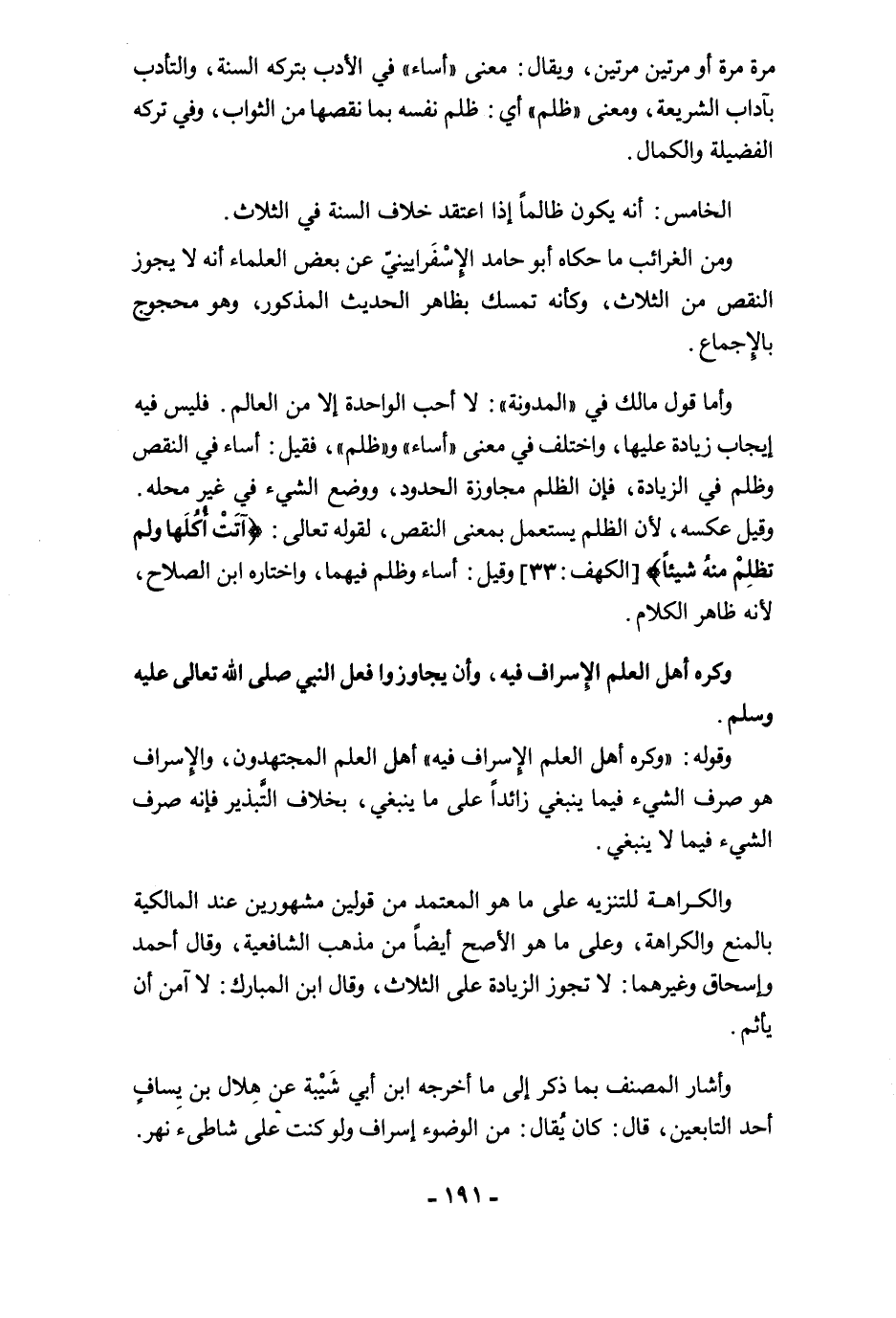 وأما قول مالك في "المدونة": لا أحب الواحدة إلا من العالم. فليس فيه إيجاب زيادة عليها، واختلف في معنى "أساء" و"ظلم"، فقيل: أساء في النقص وظلم في الزيادة، فإن الظلم مجاوزة الحدود، ووضع الشيء في غير محله. وقيل عكسه, لأن الظلم يستعمل بمعنى النقص، لقوله تعالى: {آتَتْ أُكُلَهَا وَلَمْ تَظْلِمْ مِنْهُ شَيْئًا} [الكهف: 33] وقيل: أساء وظلم فيهما، واختاره ابن الصلاح، لأنه ظاهر الكلام.
