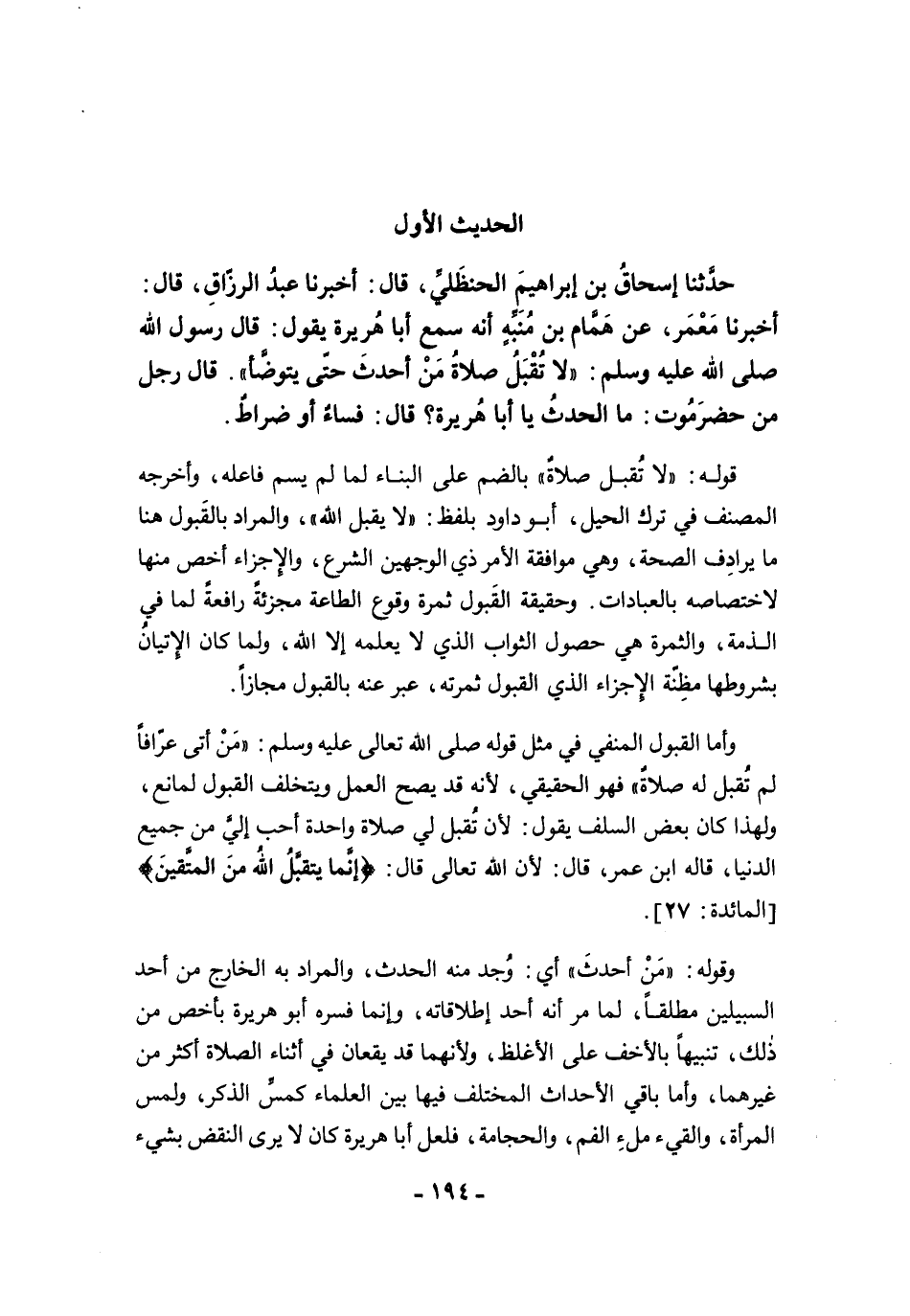 حَدَّثَنَا إِسْحَاقُ بْنُ إِبْرَاهِيمَ الْحَنْظَلِيُّ، قَالَ: أَخْبَرَنَا عَبْدُ الرَّزَّاقِ، قَالَ: أَخْبَرَنَا مَعْمَرٌ، عَنْ هَمَّامِ بْنِ مُنَبِّهٍ أَنَّهُ سَمِعَ أَبَا هُرَيْرَةَ يَقُولُ: قَالَ رَسُولُ اللَّهِ -صلى الله عليه وسلم-: "لاَ تُقْبَلُ صَلاَةُ مَنْ أَحْدَثَ حَتَّى يَتَوَضَّأَ". قَالَ رَجُلٌ مِنْ حَضْرَمَوْتَ: مَا الْحَدَثُ يَا أَبَا هُرَيْرَةَ؟ قَالَ فُسَاءٌ أَوْ ضُرَاطٌ.