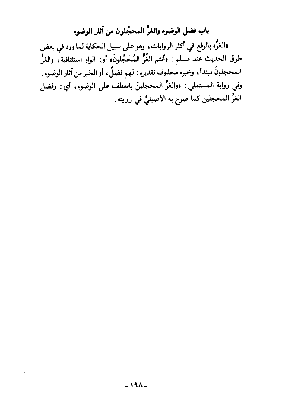 " الغرُّ" بالرفع في أكثر الروايات، وهو على سبيل الحكاية لما ورد في بعض طرق الحديث عند مسلم: "أنتم الغُرُّ المُحَجَّلونَ" أو: الواو استئنافية، والغرُّ المحجلونَ مبتدأ، وخبره محذوف تقديره: لهم فضلٌ، أو الخبر من آثار الوضوء. وفي رواية المستملي: "والغرِّ المحجلينَ بالعطف على الوضوء, أي: وفضل الغرِّ المحجلين كما صرح به الأصيليُّ في روايته.