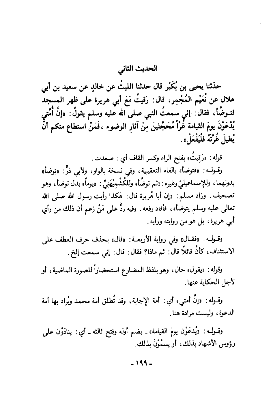 حَدَّثَنَا يَحْيَى بْنُ بُكَيْرٍ قَالَ حَدَّثَنَا اللَّيْثُ عَنْ خَالِدٍ عَنْ سَعِيدِ بْنِ أَبِى هِلاَلٍ عَنْ نُعَيْمٍ الْمُجْمِرِ، قَالَ رَقِيتُ مَعَ أَبِي هُرَيْرَةَ عَلَى ظَهْرِ الْمَسْجِدِ، فَتَوَضَّأَ، فَقَالَ إِنِّي سَمِعْتُ النَّبِيَّ -صلى الله عليه وسلم- يَقُولُ: "إِنَّ أُمَّتِي يُدْعَوْنَ يَوْمَ الْقِيَامَةِ غُرًّا مُحَجَّلِينَ مِنْ آثَارِ الْوُضُوءِ، فَمَنِ اسْتَطَاعَ مِنْكُمْ أَنْ يُطِيلَ غُرَّتَهُ فَلْيَفْعَلْ".