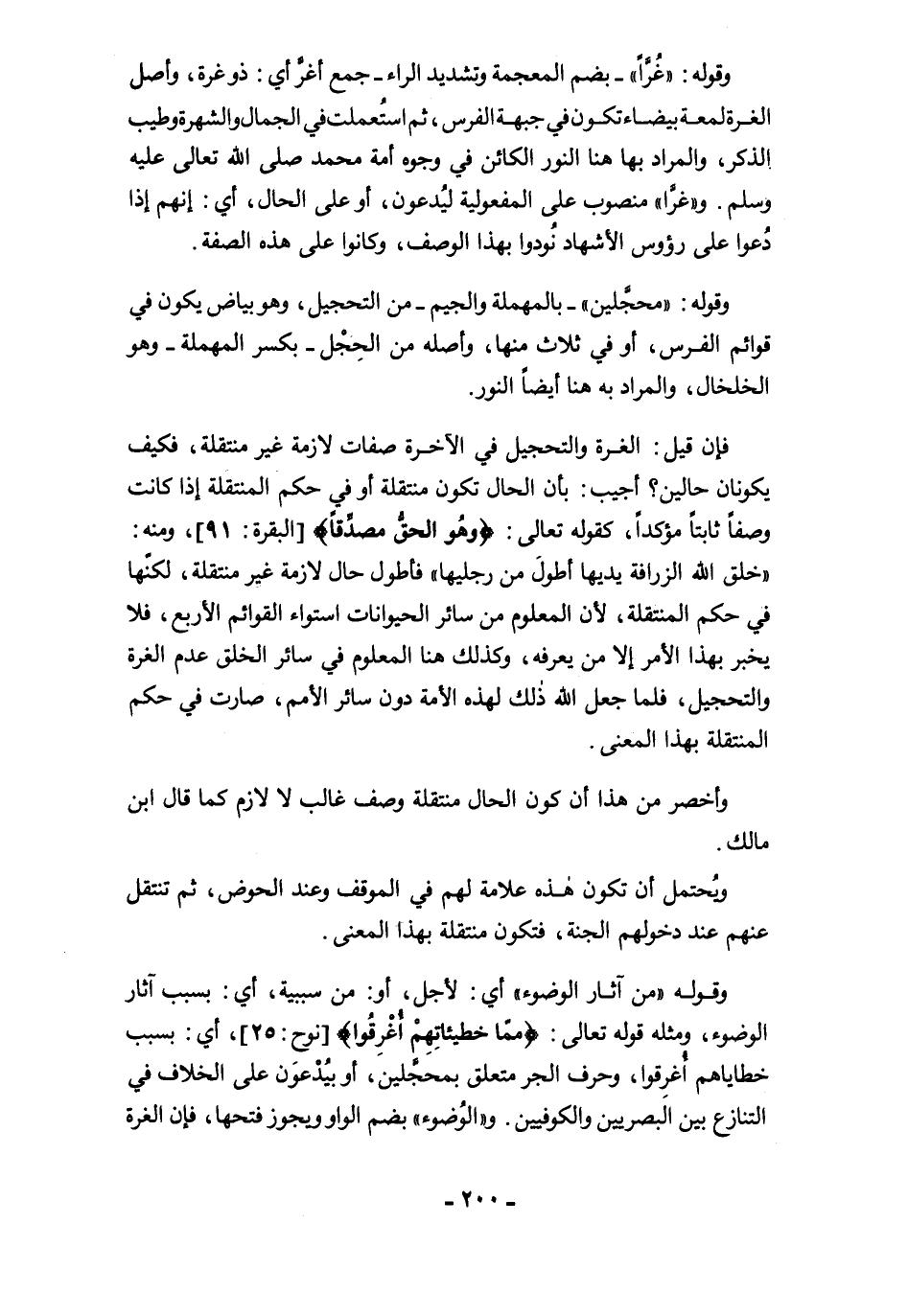 فإن قيل: الغرة والتحجيل في الآخرة صفات لازمة غير منتقلة، فكيف يكونان حالين؟ أجيب: بان الحال تكون منتقلة أو في حكم المنتقلة إذا كانت وصفًا ثابتًا مؤكدًا، كقوله تعالى: {وَهُوَ الْحَقُّ مُصَدِّقًا} [البقرة: 91]، ومنه: "خلق الله الزرافة يديها أطولَ من رجليها" فأطول حال لازمة غير منتقلة، لكنّها في حكم المنتقلة, لأن المعلوم من سائر الحيوانات استواء القوائم الأربع، فلا يخبر بهذا الأمر إلا من يعرفه، وكذلك هنا المعلوم في سائر الخلق عدم الغرة والتحجيل، فلما جعل الله ذلك لهذه الأمة دون سائر الأمم، صارت في حكم المنتقلة بهذا المعنى.
