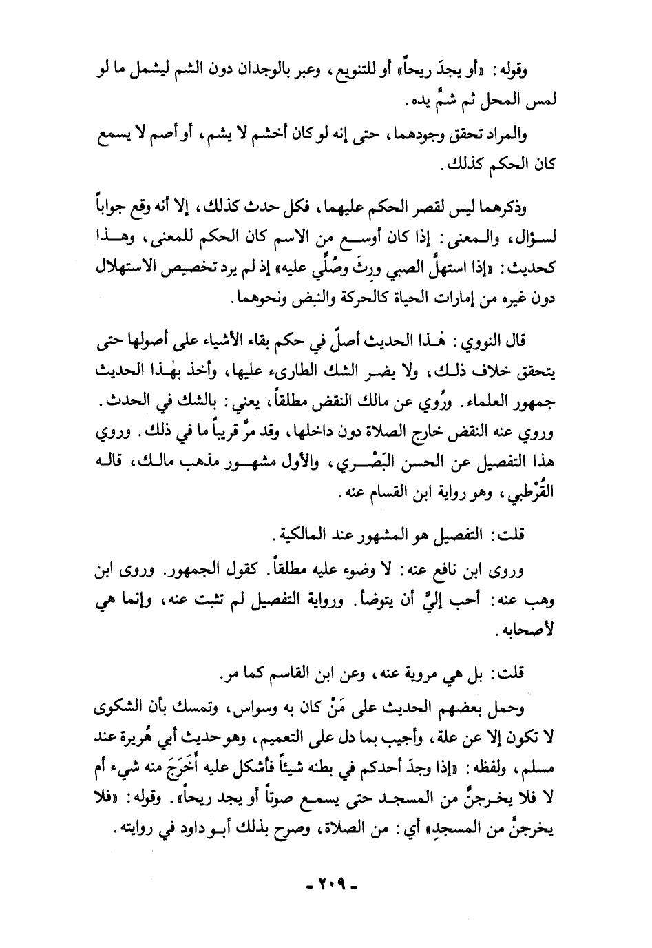 قال النووي: هذا الحديث أصل في حكم بقاء الأشياء على أصولها حتى يتحقق خلاف ذلك، ولا يضر الشك الطارىء عليها، وأخذ بهذا الحديث جمهور العلماء. ورُوي عن مالك النقض مطلقًا، يعني: بالشك في الحدث. وروي عنه النقض خارج الصلاة دون داخلها، وقد مرَّ قريبًا ما في ذلك. وروي هذا التفصيل عن الحسن البَصْري، والأول مشهور مذهب مالك، قاله القُرْطبي، وهو رواية ابن القسام عنه.