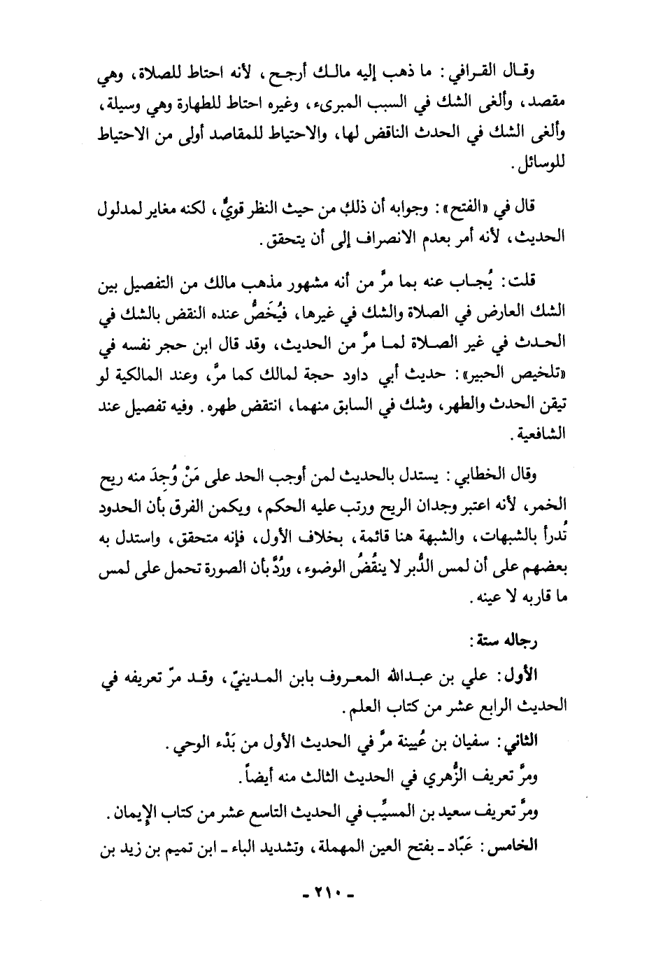 وقال القرافي: ما ذهب إليه مالك أرجح, لأنه احتاط للصلاة، وهي مقصد، وألغى الشك في السبب المبرىء، وغيره احتاط للطهارة وهي وسيلة، وألغى الشك في الحدث الناقض لها، والاحتياط للمقاصد أولى من الاحتياط للوسائل.