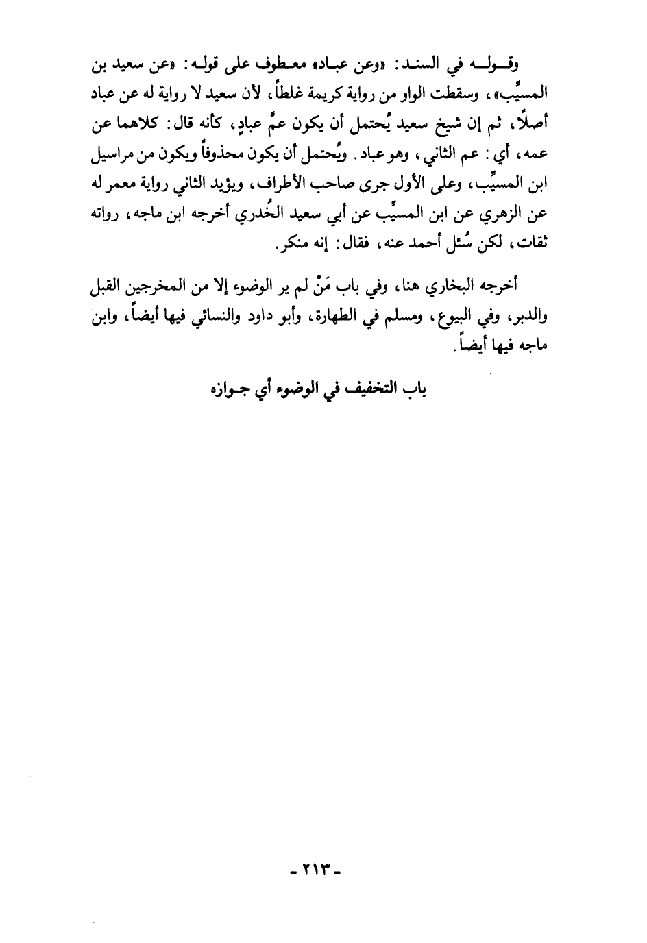 وقوله في السند: "وعن عباد" معطوف على قوله: "عن سعيد بن المسيِّب"، وسقطت الواو من رواية كريمة غلطًا, لأن سعيد لا رواية له عن عباد أصلًا، ثم إن شيخ سعيد يُحتمل أن يكون عمَّ عبادٍ، كأنه قال: كلاهما عن عمه، أي: عم الثاني، وهو عباد. ويُحتمل أن يكون محذوفًا ويكون من مراسيل ابن المسيِّب، وعلى الأول جرى صاحب الأطراف، ويؤيد الثاني رواية معمر له عن الزهري عن ابن المسيِّب عن أبي سعيد الخُدري أخرجه ابن ماجه، رواته ثقات، لكن سُئل أحمد عنه، فقال: إنه منكر.