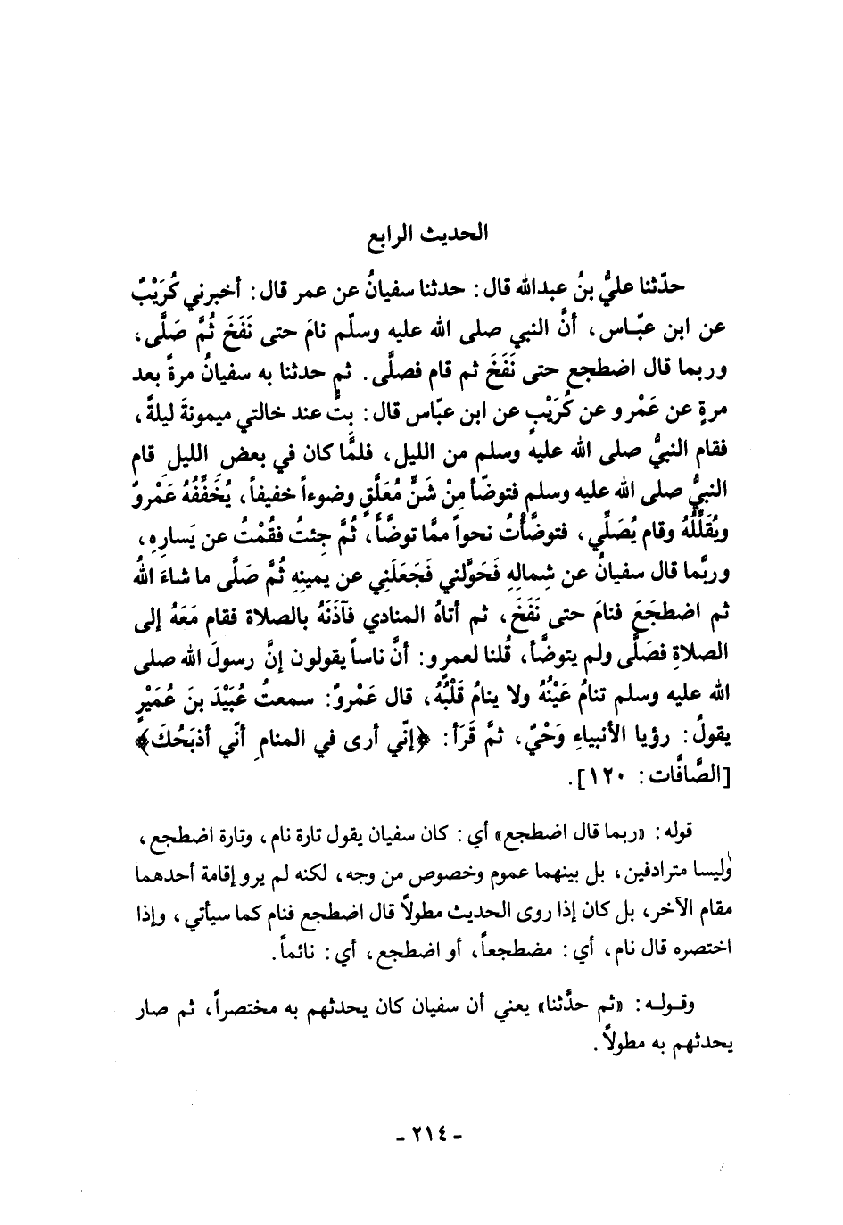 حَدَّثَنَا عَلِيُّ بْنُ عَبْدِ اللَّهِ قَالَ: حَدَّثَنَا سُفْيَانُ عَنْ عَمْرٍو قَالَ: أَخْبَرَنِي كُرَيْبٌ عَنِ ابْنِ عَبَّاسٍ، أَنَّ النَّبِيَّ -صلى الله عليه وسلم- نَامَ حَتَّى نَفَخَ ثُمَّ صَلَّى، وَرُبَّمَا قَالَ اضْطَجَعَ حَتَّى نَفَخَ ثُمَّ قَامَ فَصَلَّى. ثُمَّ حَدَّثَنَا بِهِ سُفْيَانُ مَرَّةً بَعْدَ مَرَّةٍ عَنْ عَمْرٍو عَنْ كُرَيْبٍ عَنِ ابْنِ عَبَّاسٍ قَالَ: بِتُّ عِنْدَ خَالَتِي مَيْمُونَةَ لَيْلَةً، فَقَامَ النَّبِيُّ -صلى الله عليه وسلم- مِنَ اللَّيْلِ، فَلَمَّا كَانَ فِى بَعْضِ اللَّيْلِ قَامَ النَّبِيُّ -صلى الله عليه وسلم- فَتَوَضَّأَ مِنْ شَنٍّ مُعَلَّقٍ وُضُوءًا خَفِيفًا، يُخَفِّفُهُ عَمْرٌو وَيُقَلِّلُهُ وَقَامَ يُصَلِّي، فَتَوَضَّأْتُ نَحْوًا مِمَّا تَوَضَّأَ، ثُمَّ جِئْتُ فَقُمْتُ عَنْ يَسَارِهِ، وَرُبَّمَا قَالَ سُفْيَانُ عَنْ شِمَالِهِ فَحَوَّلَنِي فَجَعَلَنِي عَنْ يَمِينِهِ، ثُمَّ صَلَّى مَا شَاءَ اللَّهُ، ثُمَّ اضْطَجَعَ، فَنَامَ حَتَّى نَفَخَ، ثُمَّ أَتَاهُ الْمُنَادِي فَآذَنَهُ بِالصَّلاَةِ، فَقَامَ مَعَهُ إِلَى الصَّلاَةِ، فَصَلَّى وَلَمْ يَتَوَضَّأْ. قُلْنَا لِعَمْرٍو: إِنَّ نَاسًا يَقُولُونَ إِنَّ رَسُولَ اللَّهِ -صلى الله عليه وسلم- تَنَامُ عَيْنُهُ وَلاَ يَنَامُ قَلْبُهُ. قَالَ عَمْرو: سَمِعْتُ عُبَيْدَ بْنَ عُمَيْرٍ يَقُولُ رُؤْيَا الأَنْبِيَاءِ وَحْيٌ، ثُمَّ قَرَأَ: {إِنِّي أَرَى فِي الْمَنَامِ أَنِّي أَذْبَحُكَ}. [الصافات: 120].