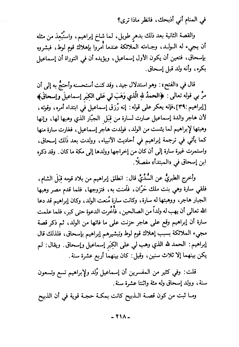 قال في "الفتح": وهو استدلال جيد، وقد كنت أستحسنه وأحتجُّ به إلى أن مرَّ بي قوله تعالى: {الْحَمْدُ لِلَّهِ الَّذِي وَهَبَ لِي عَلَى الْكِبَرِ إِسْمَاعِيلَ وَإِسْحَاقَ} [إبراهيم: 39]، فإنه يعكر على قوله: إنه رُزق إسماعيل في ابتداء أمره، وقوته، لأن هاجر والدة إسماعيل صارت لسارة من قِبَلِ الجبّار الذي وهبها لها، وإنها وهبتها لإبراهيم لما يئست من الولد، فولدت هاجر إسماعيل، فغارت سارة منها كما يأتي في ترجمة إبراهيم في أحاديث الأنبياء، وولدت بعد ذلك إسحاق، واستمرت غيرة سارة إلى أن كان من إخراجها وولدها إلى مكة ما كان. وقد ذكره ابن إسحاق في "المبتدأ" مفصلًا.