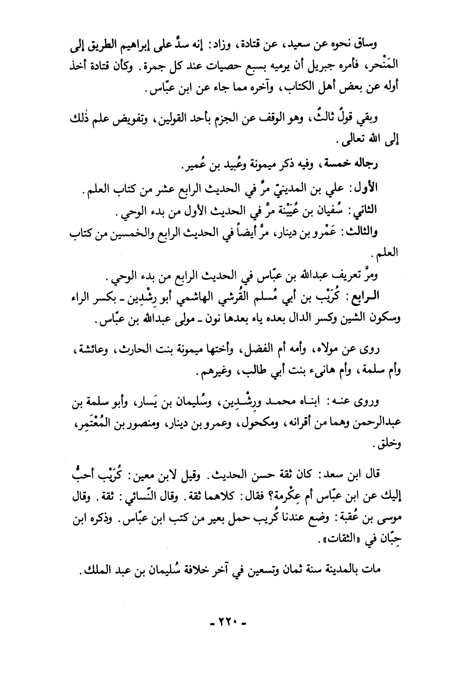 وساق نحوه عن سعيد، عن قتادة، وزاد: إنه سدَّ على إبراهيم الطريق إلى المَنْحر، فأمره جبريل أن يرميه بسبع حصيات عند كل جمرة. وكأن قتادة أخذ أوله عن بعض أهل الكتاب، وآخره مما جاء عن ابن عبّاس.
