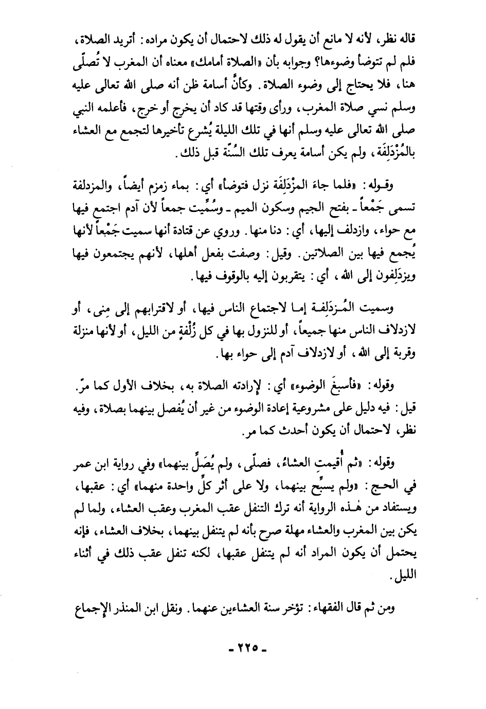 قاله نظر, لأنه لا مانع أن يقول له ذلك لاحتمال أن يكون مراده: أتريد الصلاة، فلم لم تتوضأ وضوءها؟ وجوابه بأن "الصلاة أمامك" معناه أن المغرب لا تُصلّى هنا، فلا يحتاج إلى وضوء الصلاة. وكانَّ أسامة ظن أنه صلى الله تعالى عليه وسلم نسي صلاة المغرب، ورأى وقتها قد كاد أن يخرج أو خرج، فأعلمه النبي صلى الله تعالى عليه وسلم أنها في تلك الليلة يُشرع تأخيرها لتجمع مع العشاء بالمُزْدَلِفَة، ولم يكن أسامة يعرف تلك السُنّة قبل ذلك.