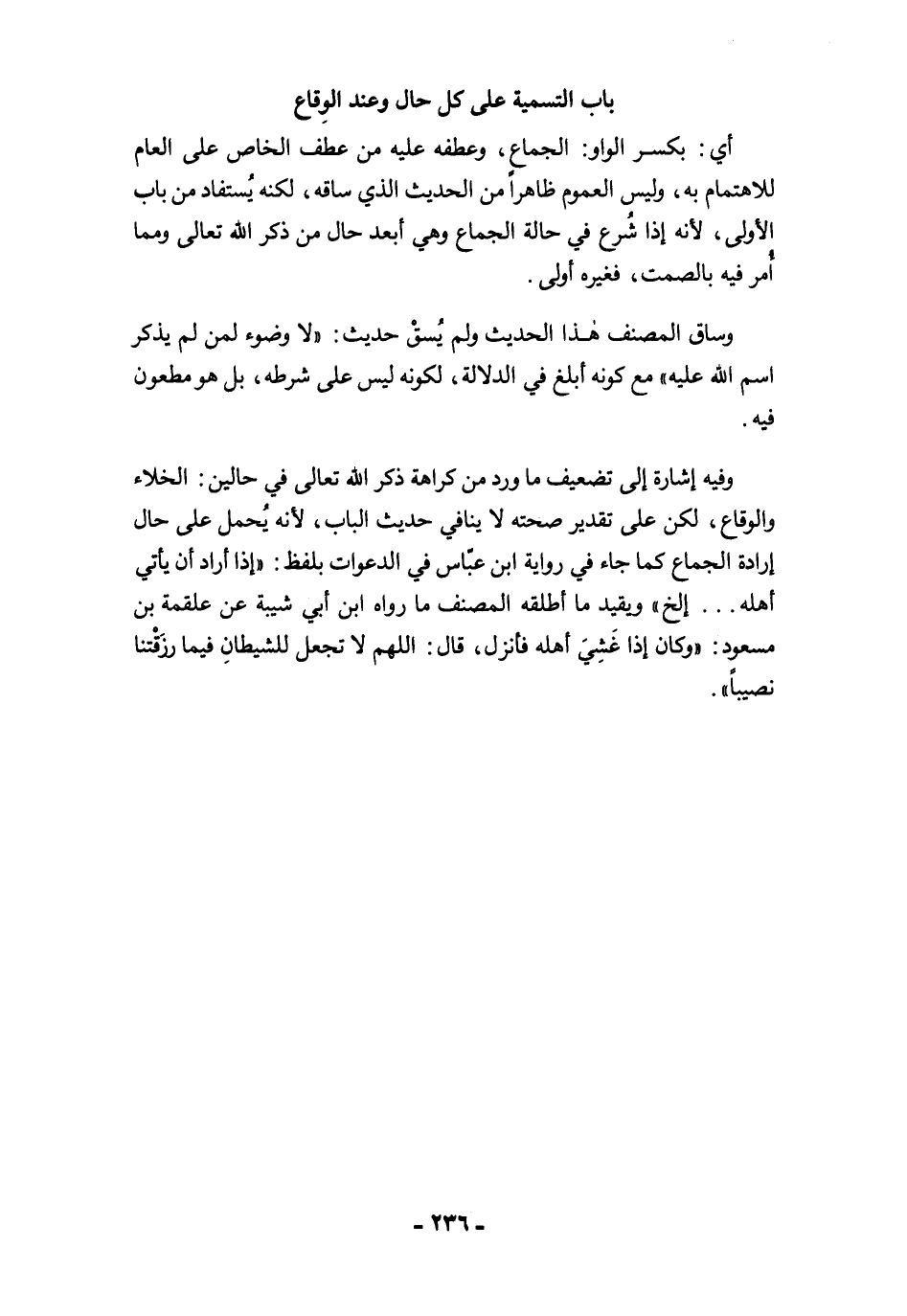 وفيه إشارة إلى تضعيف ما ورد من كراهة ذكر الله تعالى في حالين: الخلاء والوقاع، لكن على تقدير صحته لا ينافي حديث الباب؛ لأنه يُحمل على حال إرادة الجماع كما جاء في رواية ابن عبّاس في الدعوات بلفظ: "إذا أراد أن يأتي أهله ... إلخ" ويقيد ما أطلقه المصنف ما رواه ابن أبي شيبة عن علقمة بن مسعود: "وكان إذا غَشِيَ أهله فأنزل، قال: اللهم لا تجعل للشيطانِ فيما رزَقْتنا نصيبًا".