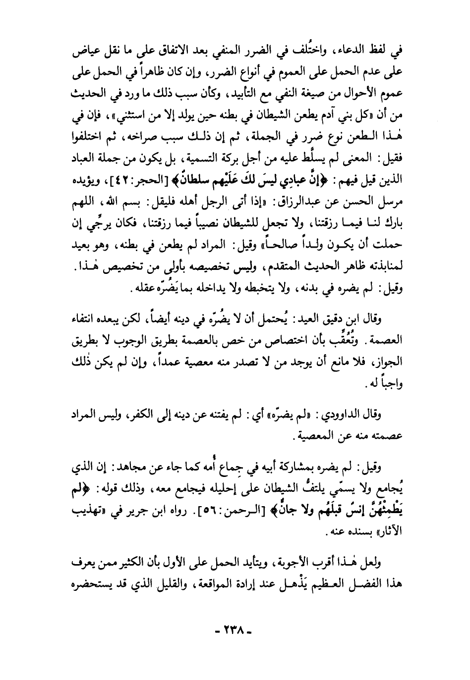 في لفظ الدعاء، واختُلف في الضرر المنفي بعد الاتفاق على ما نقل عياض على عدم العمل على العموم في أنواع الضرر، وإن كان ظاهرًا في العمل على عموم الأحوال من صيغة النفي مع التأبيد، وكأن سبب ذلك ما ورد في الحديث من أن "كل بني آدم يطعن الشيطان في بطنه حين يولد إلا من استثني"، فإن في هذا الطعن نوع ضرر في الجملة، ثم إن ذلك سبب صراخه، ثم اختلفوا فقيل: المعنى لم يسلَّط عليه من أجل بركة التسمية، بل يكون من جملة العباد الذين قيل فيهم: {إِنَّ عِبَادِي لَيْسَ لَكَ عَلَيْهِمْ سُلْطَانٌ} [الحجر: 42]، ويؤيده مرسل الحسن عن عبد الرزاق: "إذا أتى الرجل أهله فليقل: بسم الله، اللهم بارك لنا فيما رزقتنا, ولا تجعل للشيطان نصيبًا فيما رزقتنا، فكان يرجِّي إن حملت أن يكون ولدًا صالحًا" وقيل: المراد لم يطعن في بطنه، وهو بعيد لمنابذته ظاهر الحديث المتقدم، وليس تخصيصه بأولى من تخصيص هذا. وقيل: لم يضره في بدنه، ولا يتخبطه ولا يداخله بما يَضُرّه عقله.