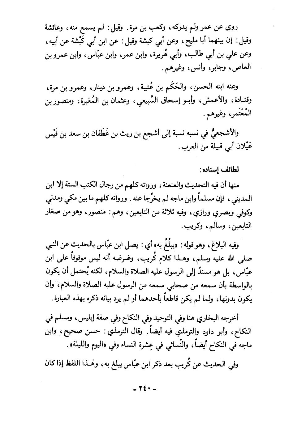 منها أن فيه التحديث والعنعنة، ورواته كلهم من رجال الكتب الستة إلا ابن المديني، فإن مسلمًا وابن ماجه لم يخرَّجا عنه. ورواته كلهم ما بين مكي ومدني وكوفي وبصري ورازي، وفيه ثلائة من التابعين، وهم: منصور، وهو من صغار التابعين، وسالم، وكريب.