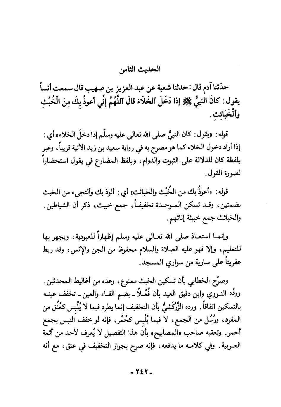 وصرّح الخطابي بأن تسكين الخبث ممنوع، وعده من أغاليط المحدثين. وردَّه النووي وابن دقيق العيد بأن فُعُلًا -بضم الفاء والعين- تخفف عينه بالتسكين اتفاقًا. ورده الزَّرْكشيُّ بأن التخفيف إنما يطرد فيما لا يُلْبس كعُنُق من المفرد، ورُسُل من الجمع، لا فيما يُلْبِس كحُمُر، فإنه لو خفف التبس بجمع أحمر. وتعقبه صاحب "المصابيح" بأن هذا التفصيل لا يُعرف لأحد من أئمة العربية. وفي كلامه ما يدفعه، فإنه صرح بجواز التخفيف في عنق، مع أنه