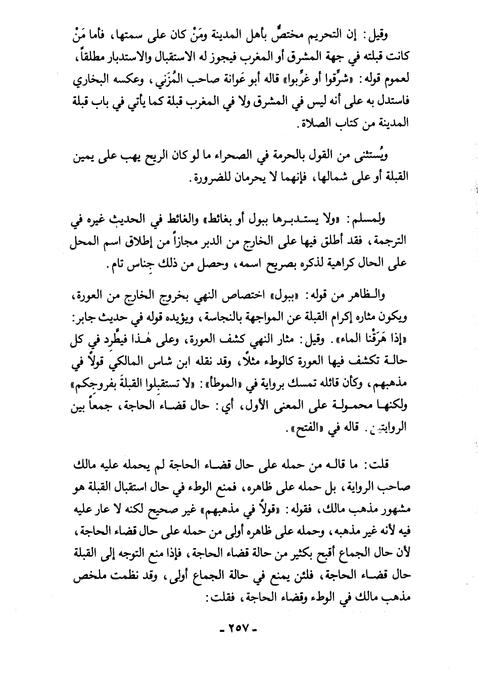 وقيل: إن التحريم مختصٌّ بأهل المدينة ومَنْ كان على سمتها، فأما مَنْ كانت قبلته في جهة المشرق أو المغرب فيجوز له الاستقبال والاستدبار مطلقًا، لعموم قوله: "شرِّقوا أو غرِّبوا" قاله أبو عَوانة صاحب المُزَني، وعكسه البخاري فاستدل به على أنه ليس في المشرق ولا في المغرب قبلة كما يأتي في باب قبلة المدينة من كتاب الصلاة.