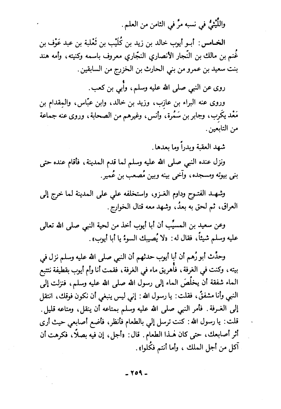 الخامس: أبو أيوب خالد بن زيد بن كُلَيْب بن ثَعْلبة بن عبد عَوْف بن غُنم بن مالك بن النّجار الأنصارى النجّاري معروف باسمه وكنيته، وأمه هند بنت سعيد بن عمرو من بني الحارث بن الخزرج من السابقين.
