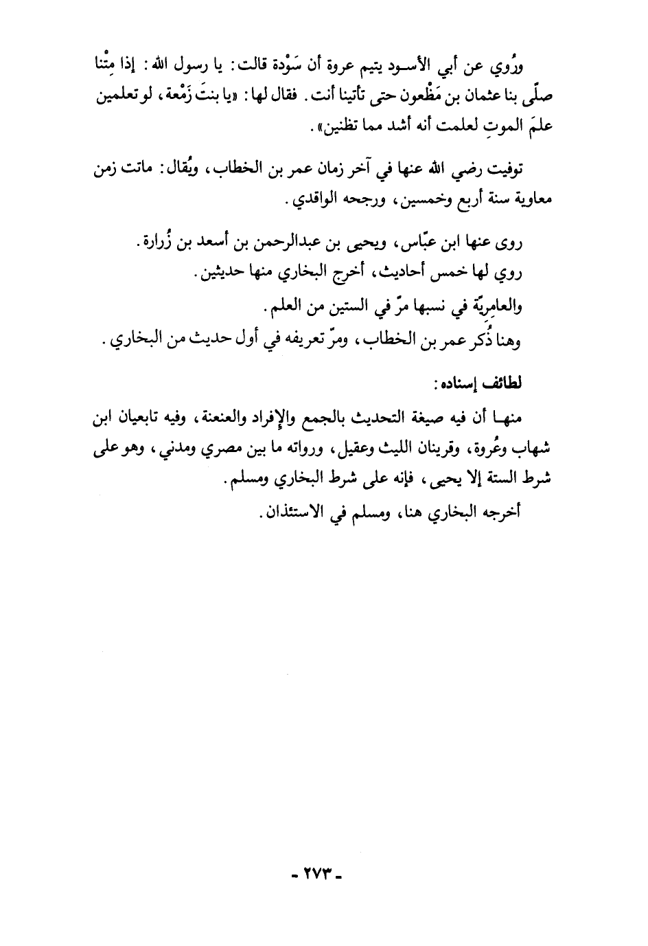 منها أن فيه صيغة التحديث بالجمع والإفراد والعنعنة، وفيه تابعيان ابن شهاب وعُروة، وقرينان الليث وعقيل، ورواته ما بين مصري ومدني، وهو على شرط الستة إلا يحيى، فإنه على شرط البخاري ومسلم.