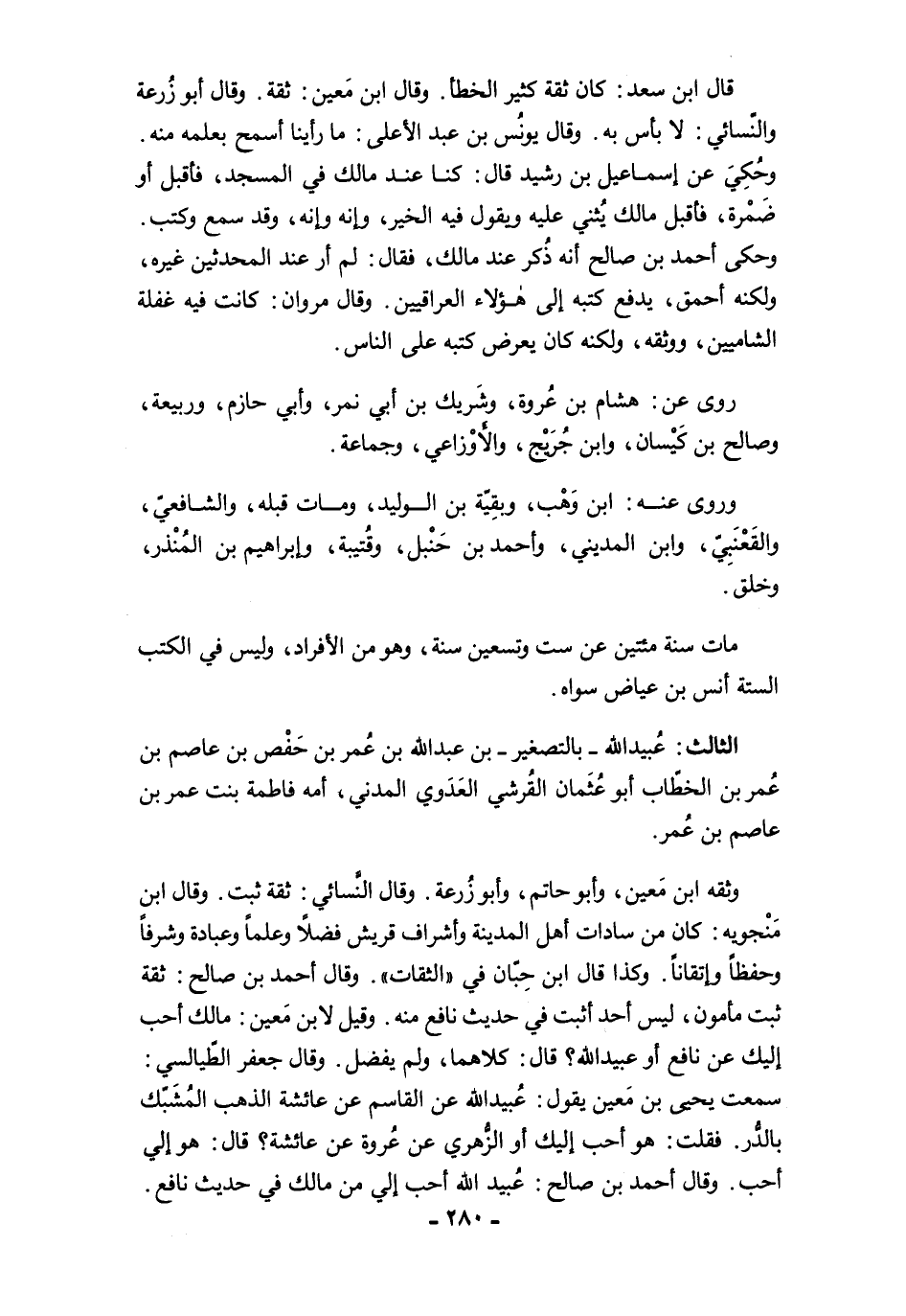 وثقه ابن مَعين، وأبو حاتم، وأبو زُرعة. وقال النَّسائي: ثقة ثبت. وقال ابن مَنْجويه: كان من سادات أهل المدينة وأشراف قريش فضلًا وعلمًا وعبادة وشرفًا وحفظًا وإتقانًا. وكذا قال ابن حِبّان في "الثقات". وقال أحمد بن صالح: ثقة ثبت مأمون، ليس أحد أثبت في حديث نافع منه. وقيل لابن مَعين: مالك أحب إليك عن نافع أو عبيد الله؟ قال: كلاهما, ولم يفضل. وقال جعفر الطّيالسي: سمعت يحيى بن مَعين يقول: عُبيد الله عن القاسم عن عائشة الذهب المُشَبّك بالدُّر. فقلت: هو أحب إليك أو الزُّهري عن عُروة عن عائشة؟ قال: هو إلي أحب. وقال أحمد بن صالح: عُبيد الله أحب إلى من مالك في حديث نافع.