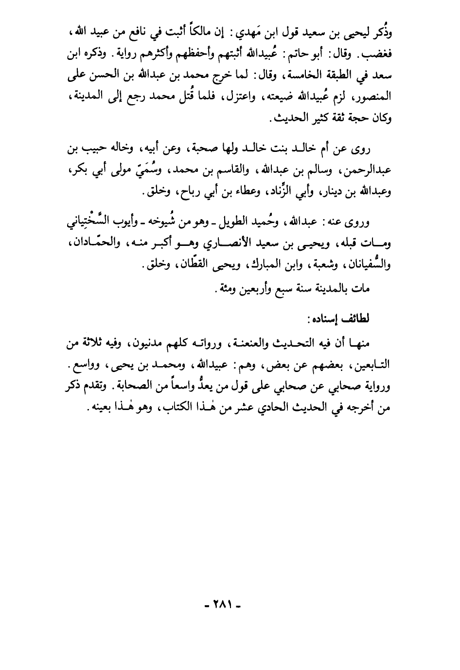 منها أن فيه التحديث والعنعنة، ورواته كلهم مدنيون، وفيه ثلاثة من التابعين، بعضهم عن بعض، وهم: عبيد الله، ومحمد بن يحيى، وواسع. ورواية صحابي عن صحابي على قول من يعدُّ واسعًا من الصحابة. وتقدم ذكر من أخرجه في الحديث الحادي عشر من هذا الكتاب، وهو هذا بعينه.