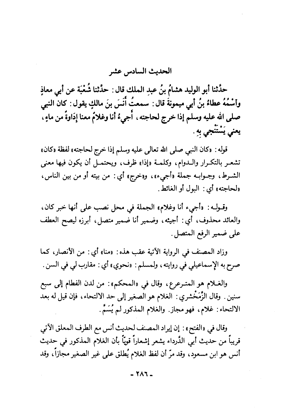 حَدَّثَنَا أَبُو الْوَلِيدِ هِشَامُ بْنُ عَبْدِ الْمَلِكِ قَالَ: حَدَّثَنَا شُعْبَةُ عَنْ أَبِى مُعَاذٍ وَاسْمُهُ عَطَاءُ بْنُ أَبِى مَيْمُونَةَ قَالَ: سَمِعْتُ أَنَسَ بْنَ مَالِكٍ يَقُولُ: كَانَ النَّبِيُّ -صلى الله عليه وسلم- إِذَا خَرَجَ لِحَاجَتِهِ، أَجِيءُ أَنَا وَغُلاَمٌ مَعَنَا إِدَاوَةٌ مِنْ مَاءٍ. يَعْنِي يَسْتَنْجِي بِهِ.