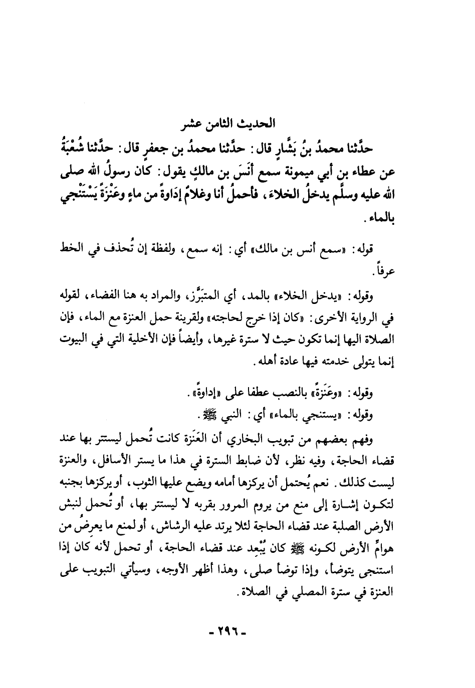 حَدَّثَنَا مُحَمَّدُ بْنُ بَشَّارٍ قَالَ: حَدَّثَنَا مُحَمَّدُ بْنُ جَعْفَرٍ قَالَ: حَدَّثَنَا شُعْبَةُ عَنْ عَطَاءِ بْنِ أَبِي مَيْمُونَةَ سَمِعَ أَنَسَ بْنَ مَالِكٍ يَقُولُ: كَانَ رَسُولُ اللَّهِ -صلى الله عليه وسلم- يَدْخُلُ الْخَلاَءَ، فَأَحْمِلُ أَنَا وَغُلاَمٌ إِدَاوَةً مِنْ مَاءٍ، وَعَنَزَةً، يَسْتَنْجِي بِالْمَاءِ.