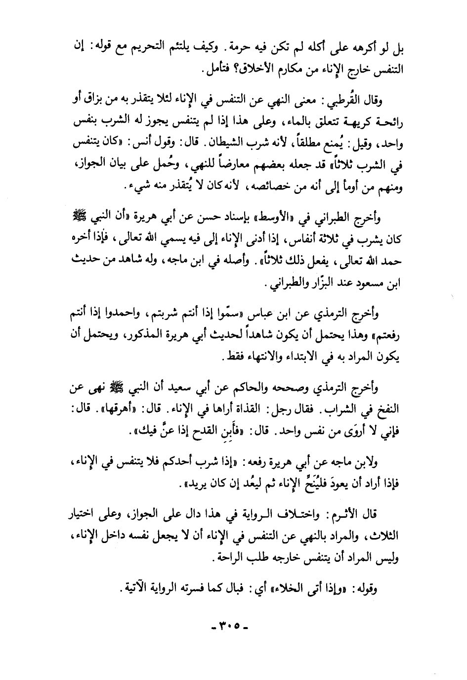 وقال القُرطبي: معنى النهي عن التنفس في الإناء لئلا يتقذر به من بزاق أو رائحة كريهة تتعلق بالماء، وعلى هذا إذا لم يتنفس يجوز له الشرب بنفس واحد، وقيل: يُمنع مطلقًا, لأنه شرب الشيطان. قال: وقول أنس: "كان يتنفس في الشرب ثلاثًا" قد جعله بعضهم معارضًا للنهي، وحُمل على بيان الجواز، ومنهم من أومأ إلى أنه من خصائصه, لأنه كان لا يُتقذر منه شيء.
