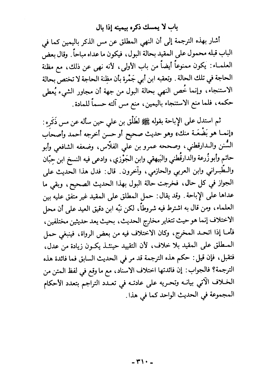 ثم استدل على الإِباحة بقوله -صلى الله عليه وسلم- لطَلْق بن علي حين سأله عن مس ذَكَرِهِ: "إنما هو بَضْعَة منك" وهو حديث صحيح أو حسن أخرجه أحمد وأصحاب السُّنن والدارقطني، وصححه عمرو بن علي الفلاّس، وضعفه الشافعي وأبو حاتم وأبو زُرعة والدارقُطني والبَيهقي وابن الجَوْزي، وادعى فيه النسخ ابن حِبّان والطّبراني وابن العربي والحازمي، وآخرون. قال: فدل هذا الحديث على الجواز في كل حال، فخرجت حالة البول بهذا الحديث الصحيح، وبقي ما عداها على الإباحة. وقد يقال: حمل المطلق على المقيد غير متفق عليه بين العلماء، ومن قال به اشترط فيه شروطًا، لكن نبه ابن دقيق العيد على أن محل الاختلاف إنما هو حيث تتغاير مخارج الحديث، بحيث يعد حديثين مختلفين، فأما إذا اتحد المخرج، وكان الاختلاف فيه من بعض الرواة، فينبغي حمل المطلق على المقيد بلا خلاف, لأن التقييد حينئذ يكون زيادة من عدل، فتقبل، فإن قيل: حكم هذه الترجمة قد مر في الحديث السابق فما فائدة هذه الترجمة؟ فالجواب: إن فائدتها اختلاف الإسناد، مع ما وقع في لفظ المتن من الخلاف الآتي بيانه وتحريه على عادته في تعدد التراجم بتعدد الأحكام المجموعة في الحديث الواحد كما في هذا.