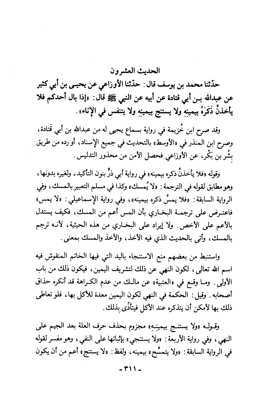 حَدَّثَنَا مُحَمَّدُ بْنُ يُوسُفَ قَالَ: حَدَّثَنَا الأَوْزَاعِيُّ عَنْ يَحْيَى بْنِ أَبِى كَثِيرٍ عَنْ عَبْدِ اللَّهِ بْنِ أَبِي قَتَادَةَ عَنْ أَبِيهِ عَنِ النَّبِيِّ -صلى الله عليه وسلم- قَالَ: "إِذَا بَالَ أَحَدُكُمْ فَلاَ يَأْخُذَنَّ ذَكَرَهُ بِيَمِينِهِ، وَلاَ يَسْتَنْجِ بِيَمِينِهِ، وَلاَ يَتَنَفَّسْ فِى الإِنَاءِ".