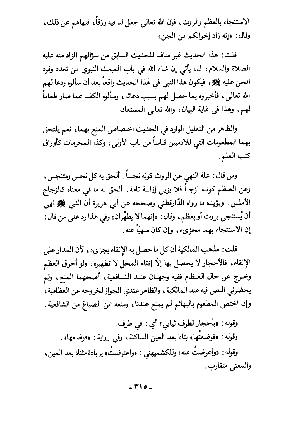 قلت: هذا الحديث غير مناف للحديث السابق من سؤالهم الزاد منه عليه الصلاة والسلام، لما يأتي إن شاء الله في باب المبعث النبوي من تعدد وفود الجن عليه -صلى الله عليه وسلم-، فيكون هذا النبي في هذا الحديث واقعًا بعد أن سألوه ودعا لهم الله تعالى، فأخبروه بما حصل لهم بسبب دعائه، وسألوه الكف عما صار طعامًا لهم، وهذا في غاية البيان، والله تعالى المستعان.