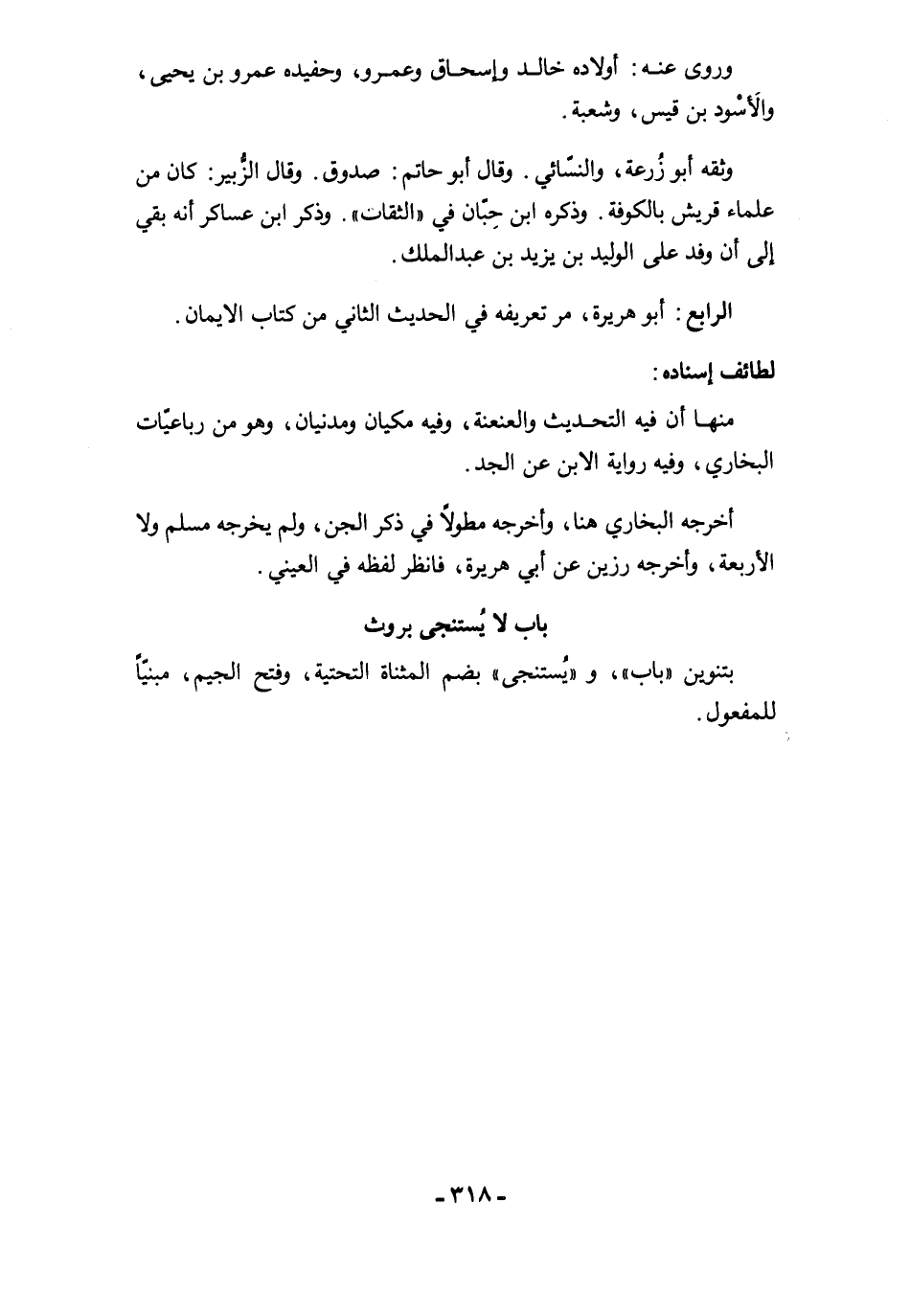 بتنوين "باب"، و"يُستنجى" بضم المثناة التحتية، وفتح الجيم، مبنيًّا للمفعول.