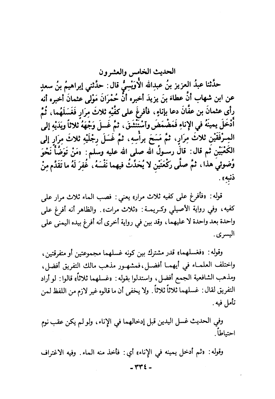 حَدَّثَنَا عَبْدُ الْعَزِيزِ بْنُ عَبْدِ اللَّهِ الأُوَيْسِيُّ قَالَ: حَدَّثَنِي إِبْرَاهِيمُ بْنُ سَعْدٍ عَنِ ابْنِ شِهَابٍ أَنَّ عَطَاءَ بْنَ يَزِيدَ أَخْبَرَهُ أَنَّ حُمْرَانَ مَوْلَى عُثْمَانَ أَخْبَرَهُ أَنَّهُ رَأَى عُثْمَانَ بْنَ عَفَّانَ دَعَا بِإِنَاءٍ، فَأَفْرَغَ عَلَى كَفَّيْهِ ثَلاَثَ مِرَارٍ فَغَسَلَهُمَا، ثُمَّ أَدْخَلَ يَمِينَهُ فِى الإِنَاءِ فَمَضْمَضَ، وَاسْتَنْشَقَ، ثُمَّ غَسَلَ وَجْهَهُ ثَلاَثًا، وَيَدَيْهِ إِلَى الْمِرْفَقَيْنِ ثَلاَثَ مِرَارٍ، ثُمَّ مَسَحَ بِرَأْسِهِ، ثُمَّ غَسَلَ رِجْلَيْهِ ثَلاَثَ مِرَارٍ إِلَى الْكَعْبَيْنِ، ثُمَّ قَالَ: قَالَ رَسُولُ اللَّهِ -صلى الله عليه وسلم-: "مَنْ تَوَضَّأَ نَحْوَ وُضُوئِي هَذَا، ثُمَّ صَلَّى رَكْعَتَيْنِ، لاَ يُحَدِّثُ فِيهِمَا نَفْسَهُ، غُفِرَ لَهُ مَا تَقَدَّمَ مِنْ ذَنْبِهِ".