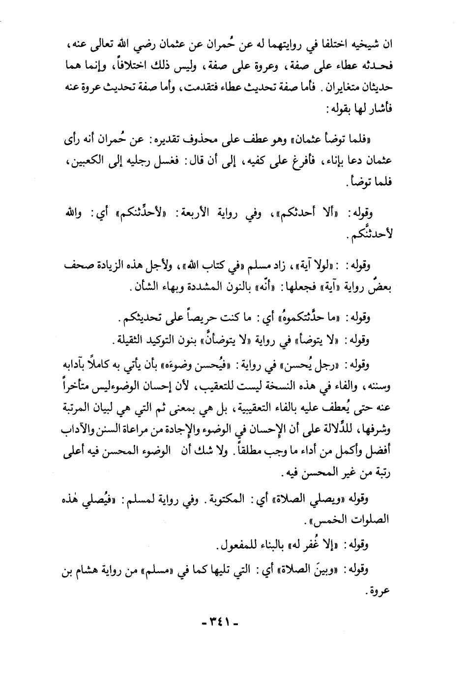 ان شيخيه اختلفا في روايتهما له عن حُمران عن عثمان رضي الله تعالى عنه، فحدثه عطاء على صفة، وعروة على صفة، وليس ذلك اختلافًا، وإنما هما حديثان متغايران. فأما صفة تحديث عطاء فتقدمت، وأما صفة تحديث عروة عنه فأشار لها بقوله: