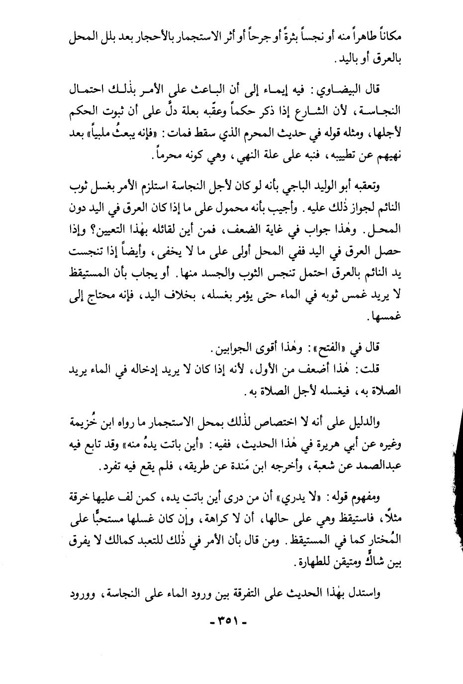 وتعقبه أبو الوليد الباجي بأنه لو كان لأجل النجاسة استلزم الأمر بغسل ثوب النائم لجواز ذلك عليه. وأجيب بأنه محمول على ما إذا كان العرق في اليد دون المحل. وهذا جواب في غاية الضعف، فمن أين لقائله بهذا التعيين؟ وإذا حصل العرق في اليد ففي المحل أولى على ما لا يخفى، وأيضًا إذا تنجست يد النائم بالعرق احتمل تنجس الثوب والجسد منها. أو يجاب بأن المستيقظ لا يريد غمس ثوبه في الماء حتى يؤمر بغسله، بخلاف اليد، فإنه محتاج إلى غمسها.