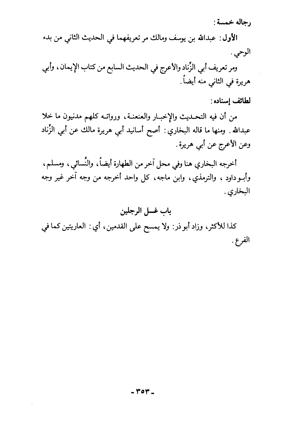 من أن فيه التحديث والإخبار والعنعنة، ورواته كلهم مدنيون ما خلا عبد الله. ومنها ما قاله البخاري: أصح أسانيد أبي هريرة مالك عن أبي الزِّناد وعن الأعرج عن أبي هريرة.