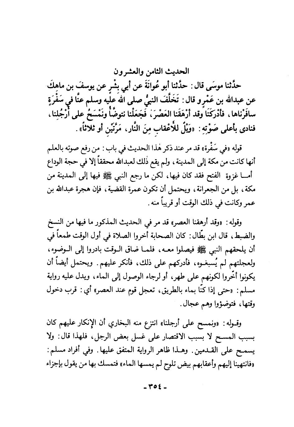 حَدَّثَنَا مُوسَى قَالَ: حَدَّثَنَا أَبُو عَوَانَةَ عَنْ أَبِي بِشْرٍ عَنْ يُوسُفَ بْنِ مَاهَكَ عَنْ عَبْدِ اللَّهِ بْنِ عَمْرٍو قَالَ: تَخَلَّفَ النَّبِيُّ -صلى الله عليه وسلم- عَنَّا فِى سَفْرَةٍ سَافَرْنَاهَا، فَأَدْرَكَنَا وَقَدْ أَرْهَقْنَا الْعَصْرَ، فَجَعَلْنَا نَتَوَضَّأُ وَنَمْسَحُ عَلَى أَرْجُلِنَا، فَنَادَى بِأَعْلَى صَوْتِهِ: "وَيْلٌ لِلأَعْقَابِ مِنَ النَّارِ، مَرَّتَيْنِ أَوْ ثَلاَثًا".