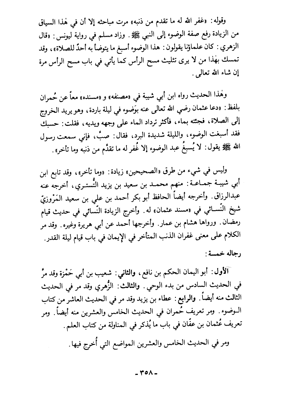 وهذا الحديث رواه ابن أبي شيبة في "مصنفه" و"مسنده" معًا عن حُمران بلفظ: "دعا عثمان رضي الله تعالى عنه بوضوء في ليلة باردة، وهو يريد الخروج إلى الصلاة، فجئته بماء، فأكثر ترداد الماء على وجهه ويديه، فقلت: حسبك فقد أسبغت الوضوء، والليلة شديدة البرد، فقال: صبَّ، فإني سمعت رسول الله -صلى الله عليه وسلم- يقول: لا يُسبغُ عبد الوضوء إلا غُفر له ما تقدَّم من ذنبه وما تأخر".
