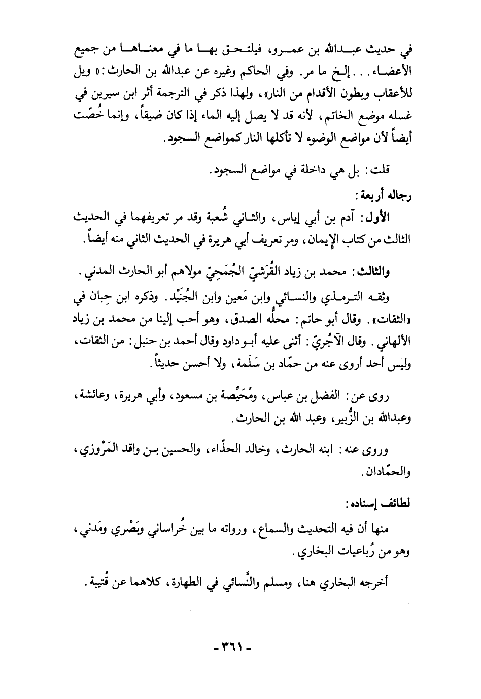 في حديث عبد الله بن عمرو، فيلتحق بها ما في معناها من جميع الأعضاء ... إلخ ما مر. وفي الحاكم وغيره عن عبد الله بن الحارث: "ويل للأعقاب وبطون الأقدام من النار"، ولهذا ذكر في الترجمة أثر ابن سيرين في غسله موضع الخاتم, لأنه قد لا يصل إليه الماء إذا كان ضيقًا، وإنما خُصّت أيضًا لأن مواضع الوضوء لا تأكلها النار كمواضع السجود.