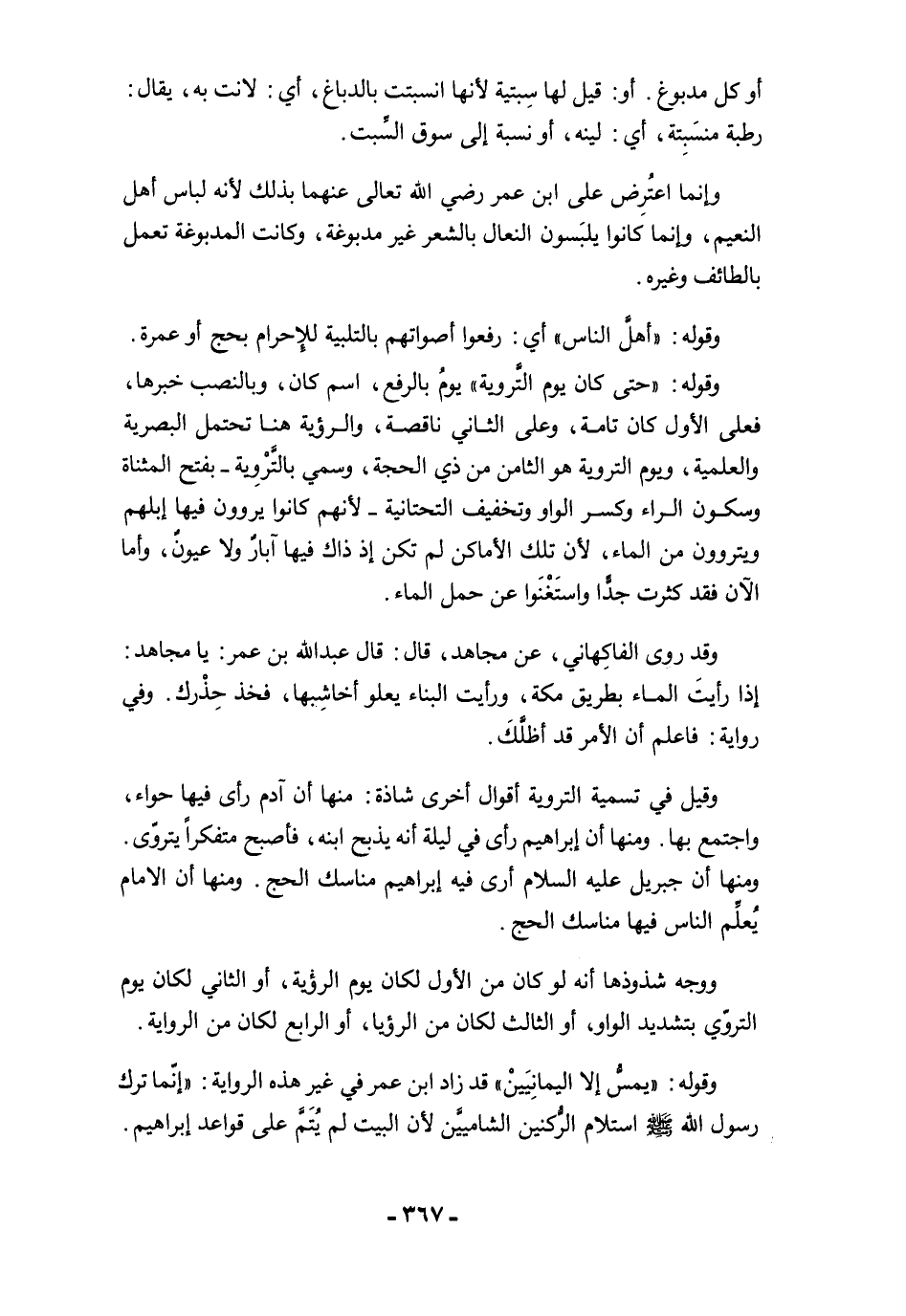 وقوله: "حتى كان يوم التَّروية" يومُ بالرفع، اسم كان، وبالنصب خبرها، فعلى الأول كان تامة، وعلى الثاني ناقصة، والرؤية هنا تحتمل البصرية والعلمية، ويوم التروية هو الثامن من ذي الحجة، وسمي بالتَّرْوِية -بفتح المثناة وسكون الراء وكسر الواو وتخفيف التحتانية- لأنهم كانوا يروون فيها إبلهم ويتروون من الماء, لأن تلك الأماكن لم تكن إذ ذاك فيها آبارٌ ولا عيونٌ، وأما الآن فقد كئرت جدًّا واستَغْنَوا عن حمل الماء.