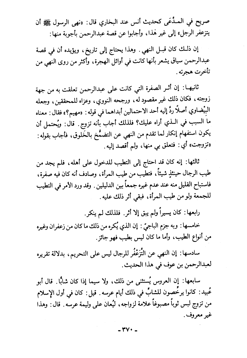 سادسها: إن النهي عن التَّزَعْفُر للرجال ليس على التحريم، بدلالة تقريره لعبد الرحمن بن عوف في هذا الحديث.