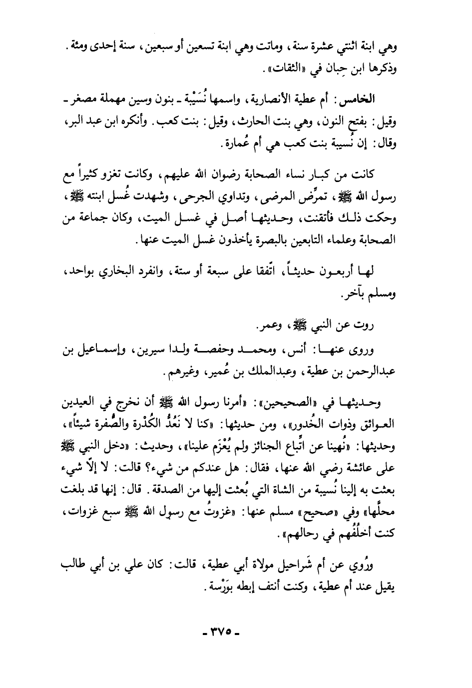 الخامس: أم عطية الأنصارية، واسمها نُسَيْبة -بنون وسين مهملة مصغر- وقيل: بفتح النون، وهي بنت الحارث، وقيل: بنت كعب. وأنكره ابن عبد البر، وقال: إن نُسيبة بنت كعب هي أم عُمارة.