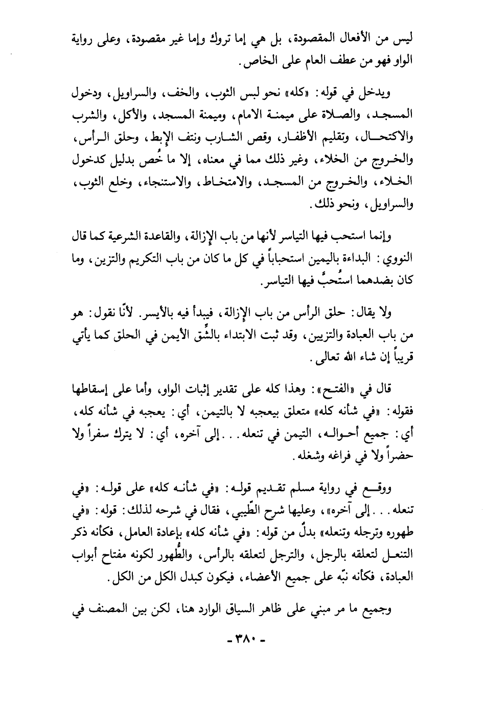 ويدخل في قوله: "كله" نحو لبس الثوب، والخف، والسراويل، ودخول المسجد، والصلاة على ميمنة الإمام، وميمنة المسجد، والأكل، والشرب والاكتحال، وتقليم الأظفار، وقص الشارب ونتف الإبط، وحلق الرأس، والخروج من الخلاء، وغير ذلك مما في معناه، إلا ما خُص بدليل كدخول الخلاء، والخروج من المسجد، والامتخاط، والاستنجاء، وخلع الثوب، والسراويل، ونحو ذلك.