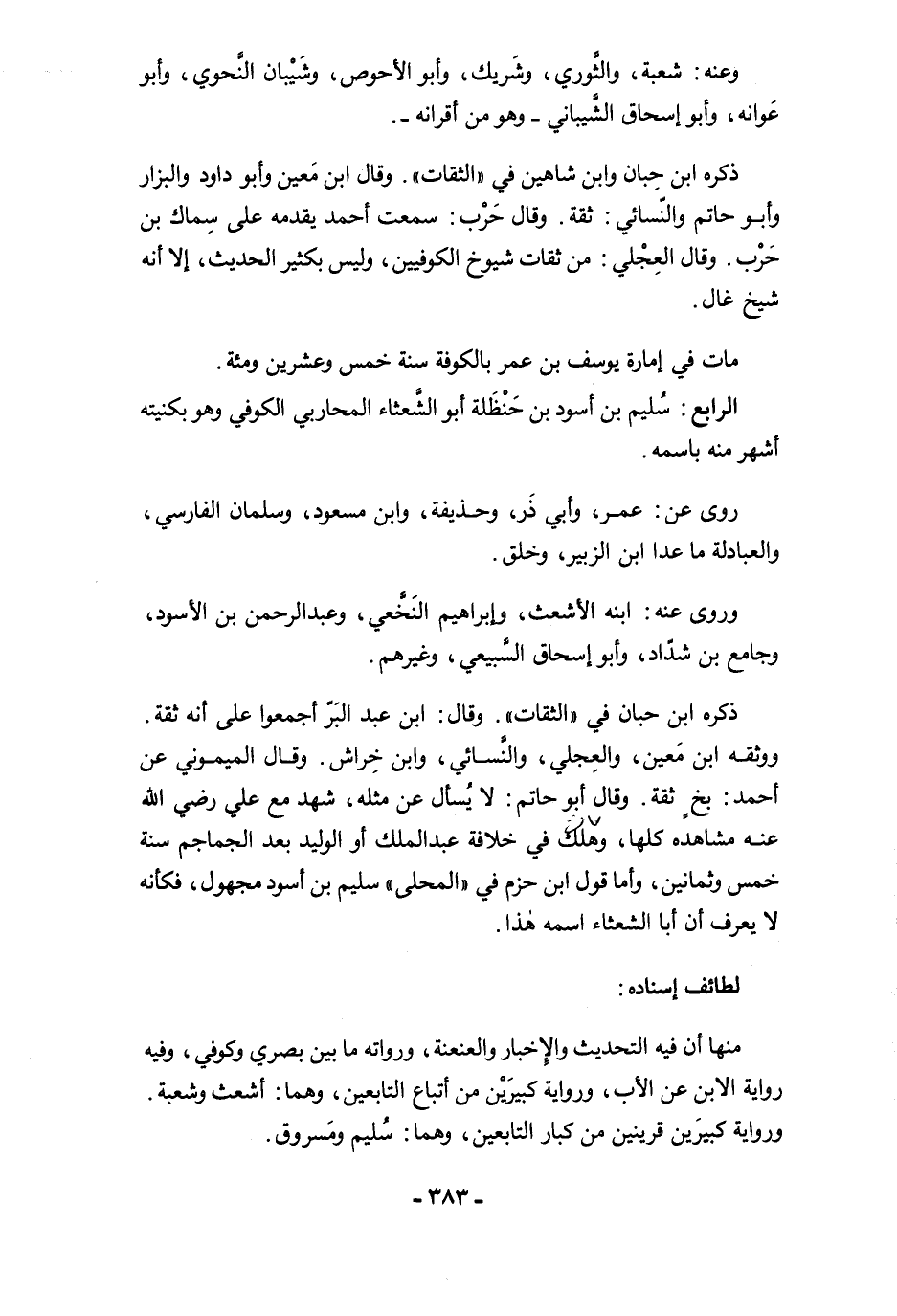 ذكره ابن حبان في "الثقات". وقال: ابن عبد البَرّ أجمعوا على أنه ثقة. ووثقه ابن مَعين، والعِجلي، والنَّسائي، وابن خِراش. وقال الميموني عن أحمد: بخٍ ثقة. وقال أبو حاتم: لا يُسأل عن مثله، شهد مع علي رضي الله عنه مشاهده كلها، ومات في خلافة عبد الملك أو الوليد بعد الجماجم سنة خمس وثمانين، وأما قول ابن حزم في "المحلى" سليم بن أسود مجهول، فكأنه لا يعرف أن أبا الشعثاء اسمه هذا.