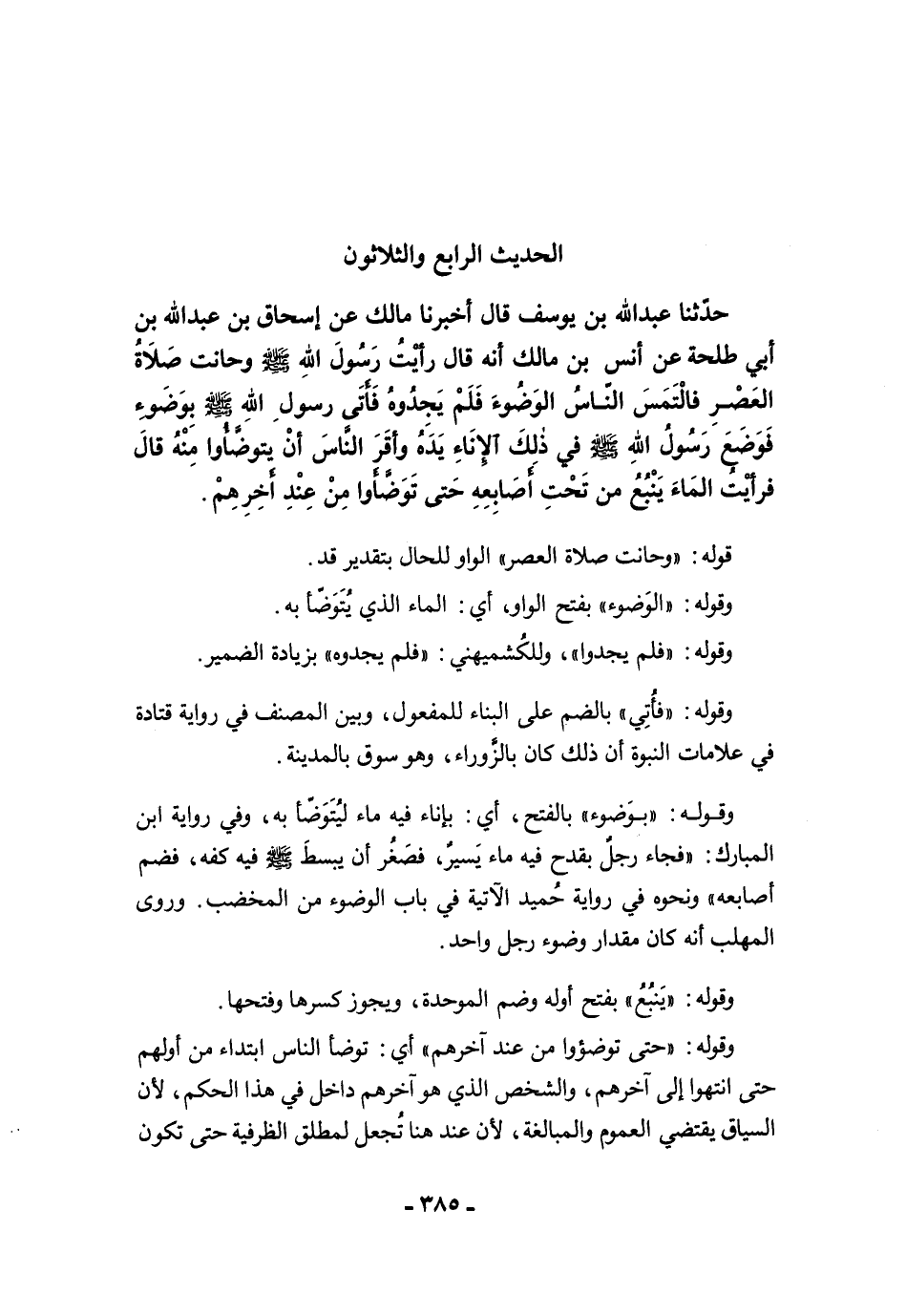 حَدَّثَنَا عَبْدُ اللَّهِ بْنُ يُوسُفَ قَالَ أَخْبَرَنَا مَالِكٌ عَنْ إِسْحَاقَ بْنِ عَبْدِ اللَّهِ بْنِ أَبِى طَلْحَةَ عَنْ أَنَسِ بْنِ مَالِكٍ أَنَّهُ قَالَ رَأَيْتُ رَسُولَ اللَّهِ -صلى الله عليه وسلم- وَحَانَتْ صَلاَةُ الْعَصْرِ، فَالْتَمَسَ النَّاسُ الْوَضُوءَ فَلَمْ يَجِدُوهُ، فَأُتِيَ رَسُولُ اللَّهِ -صلى الله عليه وسلم- بِوَضُوءٍ، فَوَضَعَ رَسُولُ اللَّهِ -صلى الله عليه وسلم- فِي ذَلِكَ الإِنَاءِ يَدَهُ، وَأَمَرَ النَّاسَ أَنْ يَتَوَضَّئُوا مِنْهُ. قَالَ فَرَأَيْتُ الْمَاءَ يَنْبُعُ مِنْ تَحْتِ أَصَابِعِهِ حَتَّى تَوَضَّئُوا مِنْ عِنْدِ آخِرِهِمْ.