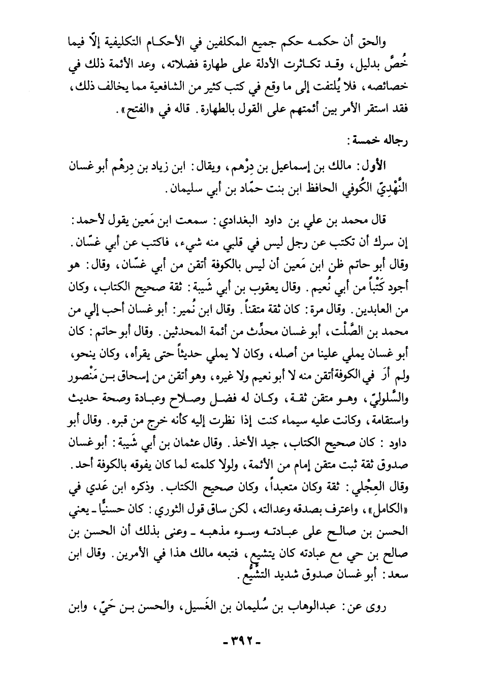 قال محمد بن علي بن داود البغدادي: سمعت ابن مَعين يقول لأحمد: إن سرك أن تكتب عن رجل ليس في قلبي منه شيء، فاكتب عن أبي غسّان. وقال أبو حاتم ظن ابن مَعين أن ليس بالكوفة أتقن من أبي غسّان، وقال: هو أجود كَتْبًا من أبي نُعيم. وقال يعقوب بن أبي شَيبة: ثقة صحيح الكتاب، وكان من العابدين. وقال مرة: كان ثقة متقنًا. وقال ابن نُمير: أبو غسان أحب إلى من محمد بن الصَّلْت، أبو غسان محدِّث من أئمة المحدثين. وقال أبو حاتم: كان أبو غسان يملي علينا من أصله، وكان لا يملي حديثًا حتى يقرأه، وكان ينحو، ولم أرَ في الكوفة أتقن منه لا أبو نعيم ولا غيره، وهو أتقن من إسحاق بن مَنْصور والسَّلوليّ، وهو متقن ثقة، وكان له فضل وصلاح وعبادة وصحة حديث واستقامة، وكانت عليه سيماء كنت إذا نظرت إليه كأنه خرج من قبره. وقال أبو داود: كان صحيح الكتاب، جيد الأخذ. وقال عثمان بن أبي شَيبة: أبو غسان صدوق ثقة ثبت متقن إمام من الأئمة، ولولا كلمته لما كان يفوقه بالكوفة أحد. وقال العِجْلي: ثقة وكان متعبدًا، وكان صحيح الكتاب. وذكره ابن عَدي في "الكامل"، واعترف بصدقه وعدالته، لكن ساق قول الثوري: كان حسنيًّا -يعني الحسن بن صالح على عبادته وسوء مذهبه- وعنى بذلك أن الحسن بن صالح بن حي مع عبادته كان يتشيع، فتبعه مالك هذا في الأمرين. وقال ابن سعد: أبو غسان صدوق شديد التشيُّع.