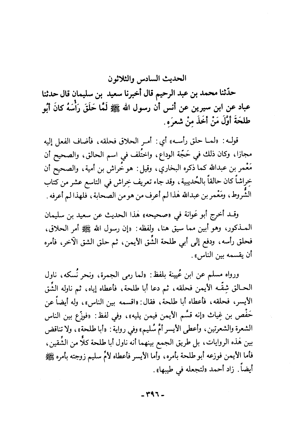وقد أخرج أبو عَوانة في "صحيحه" هذا الحديث عن سعيد بن سليمان المذكور، وهو أبين مما سيق هنا, ولفظه: "إن رسول الله -صلى الله عليه وسلم- أمر الحلاق، فحلق رأسه، ودفع إلى أبي طلحة الشِّق الأيمن، ثم حلق الشق الآخر، فأمره أن يقسمه بين الناس".