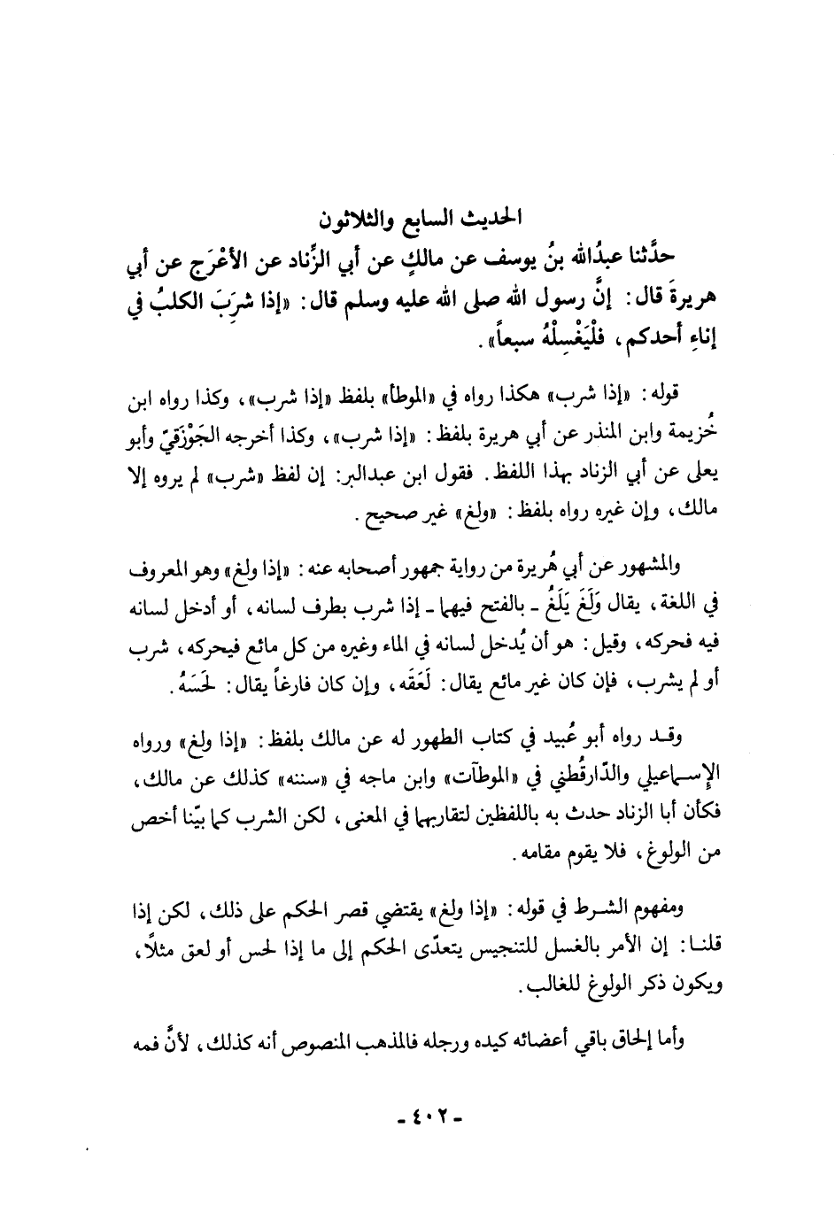 وقد رواه أبو عُبيد في كتاب الطهور له عن مالك بلفظ: "إذا ولغ" ورواه الإسماعيلي والدّارقُطني في "الموطآت" وابن ماجه في "سننه" كذلك عن مالك، فكأن أبا الزناد حدث به باللفظين لتقاربهما في المعنى، لكن الشرب كما بيّنا أخص من الولوغ، فلا يقوم مقامه.