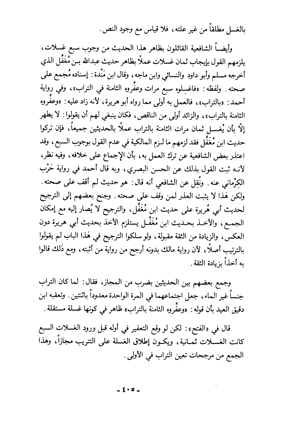 وأيضًا الشافعية القائلون بظاهر هذا الحديث من وجوب سبع غسلات، يلزمهم القول بإيجاب ثمان غسلات عملًا بظاهر حديث عبد الله بن مُغَفَّل الذي أخرجه مسلم وأبو داود والنسائي وابن ماجه، وقال ابن مَنْدة: إسناده مُجمع على صحته. ولفظه: "فاغسِلوه سبع مرات وعفِّروه الثامنة في التراب"، وفي رواية أحمد: "بالتراب"، فالعمل به أولى مما رواه أبو هريرة؛ لأنه زاد عليه: "وعفِّروه الثامنة بالتراب"، والزائد أولى من الناقص، فكان ينبغي لهم أن يقولوا: لا يطهر إلاَّ بأن يُغسل ثمان مرات الثامنة بالتراب عملًا بالحديثين جميعًا، فإن تركوا حديث ابن مُغَفَّل فقد لزمهم ما لزم المالكية في عدم القول بوجوب السبع، وقد اعتذر بعض الشافعية عن ترك العمل به، بأن الإجماع على خلافه، وفيه نظر، لأنه ثبت القول بذلك عن الحسن البصري، وبه قال أحمد في رواية حَرْب الكِرْماني عنه. ونُقِل عن الشافعي أنه قال: هو حديث لم أقف على صحته. ولكن هذا لا يثبت العذر لمن وقف على صحته. وجنح بعضهم إلى الترجيح لحديث أبي هُريرة على حديث ابن مُغَفَّل، والترجيح لا يُصار إليه مع إمكان الجمع، والأخذ بحديث ابن مُغَفَّل يستلزم الأخذ بحديث أبي هريرة دون العكس، والزيادة من الثقة مقبولة، ولو سلكوا الترجيح في هذا الباب لم يقولوا بالترتيب أصلًا, لأن رواية مالك بدونه أرجح من رواية من أثبته، ومع ذلك قالوا به أخذًا بزيادة الثقة.
