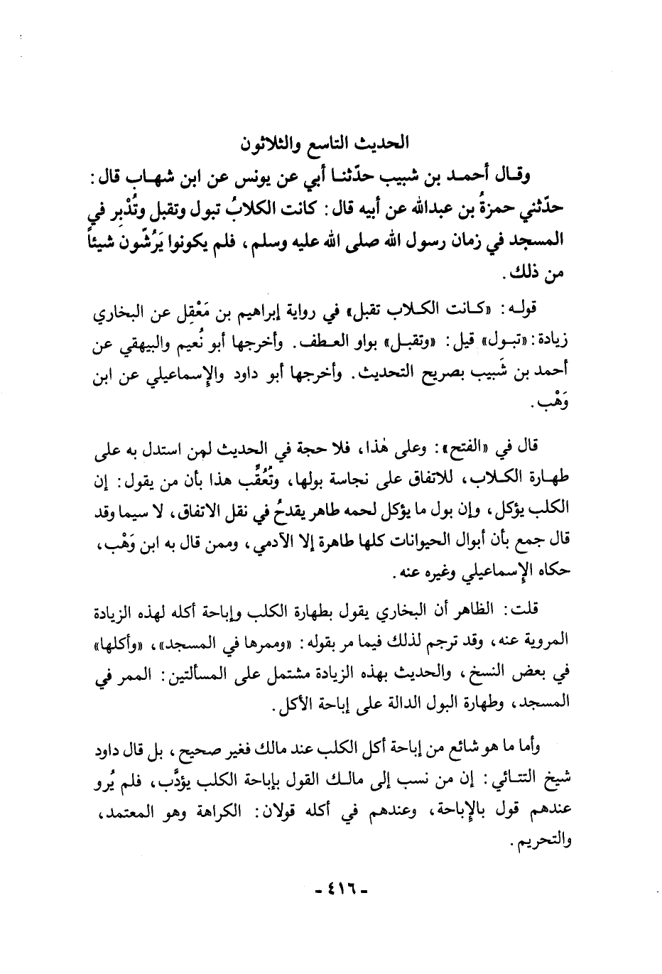 وَقَالَ أَحْمَدُ بْنُ شَبِيبٍ حَدَّثَنَا أَبِي عَنْ يُونُسَ عَنِ ابْنِ شِهَابٍ قَالَ: حَدَّثَنِي حَمْزَةُ بْنُ عَبْدِ اللَّهِ عَنْ أَبِيهِ قَالَ: كَانَتِ الْكِلاَبُ تَبُولُ وَتُقْبِلُ وَتُدْبِرُ فِى الْمَسْجِدِ فِى زَمَانِ رَسُولِ اللَّهِ -صلى الله عليه وسلم- فَلَمْ يَكُونُوا يَرُشُّونَ شَيْئًا مِنْ ذَلِكَ.