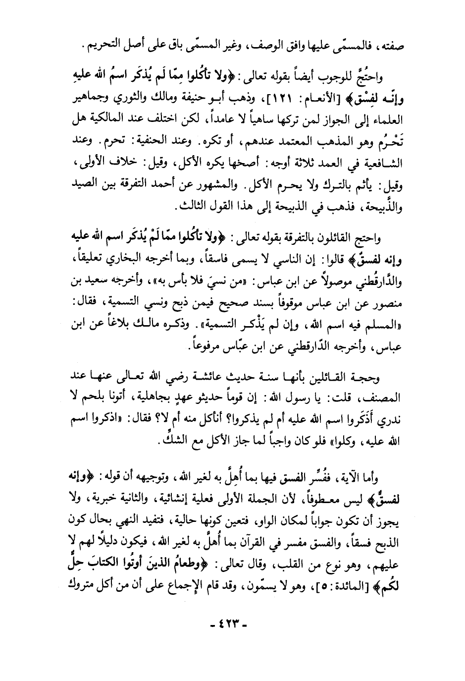 وأما الآية، ففُسِّر الفسق فيها بما أُهِلَّ به لغير الله، وتوجيهه أن قوله: {وَإِنَّهُ لَفِسْقٌ} ليس معطوفًا, لأن الجملة الأولى فعلية إنشائية، والثانية خبرية، ولا يجوز أن تكون جوابًا لمكان الواو، فتعين كونها حالية، فتفيد النهي بحال كون الذبح فسقًا، والفسق مفسر في القرآن بما أُهلَّ به لغير الله، فيكون دليلًا لهم لا عليهم، وهو نوع من القلب، وقال تعالى: {وَطَعَامُ الَّذِينَ أُوتُوا الْكِتَابَ حِلٌّ لَكُمْ} [المائدة: 5]، وهو لا يسمّون، وقد قام الإجماع على أن من أكل متروك