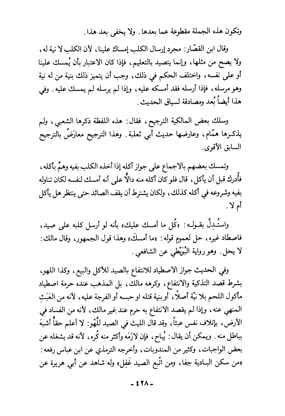 وتمسك بعضهم بالاجماع على جواز أكله إذا أخذه الكلب بفيه وهمَّ باكله، فأُدرك قبل أن يأكل، قال فلو كان أكله منه دالاًّ على أنه أمسك لنفسه لكان تناوله بفيه وشروعه في أكله كذلك، ولكان يشترط أن يقف الصائد حتى ينتظر هل يأكل أم لا.