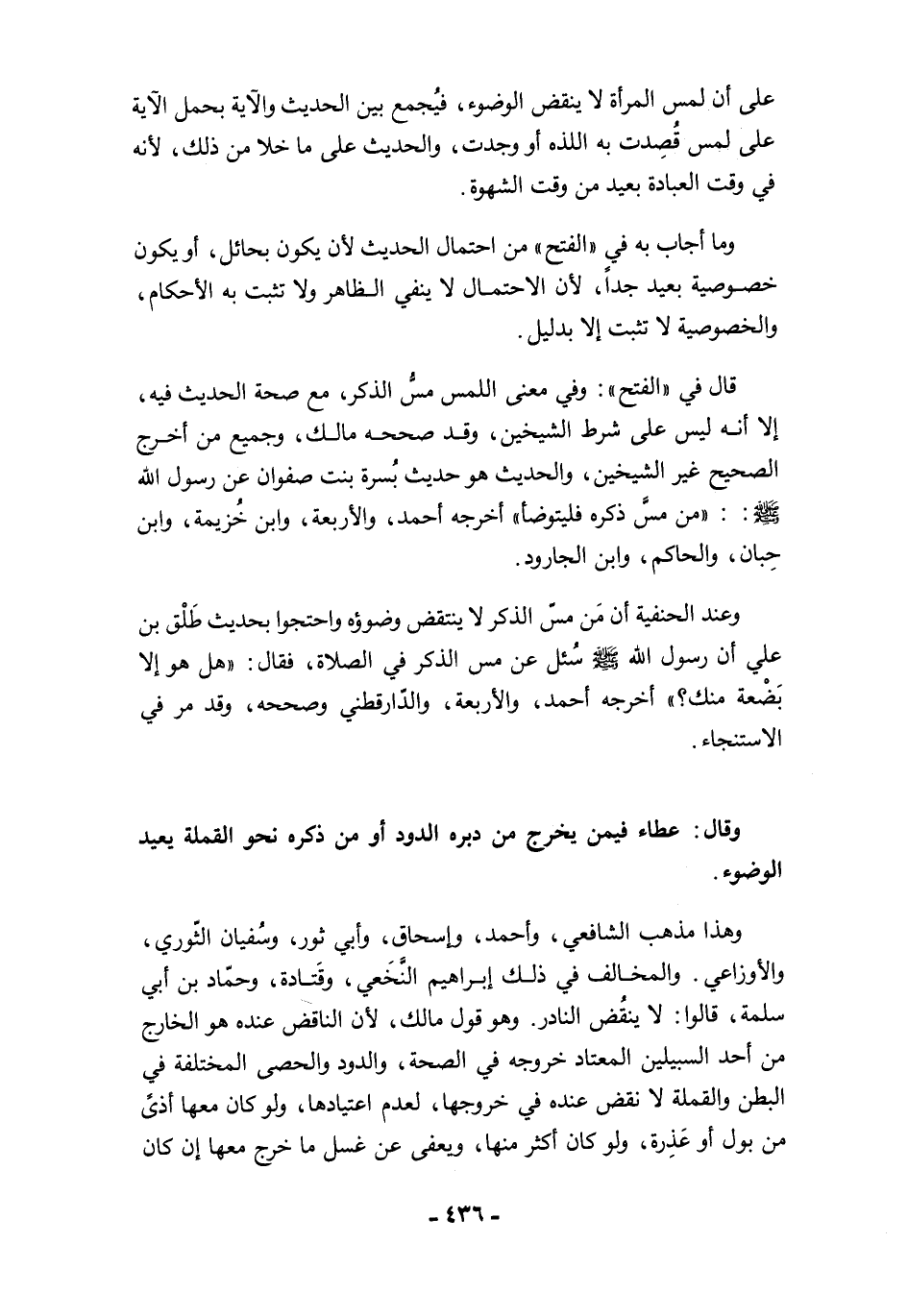 وعند الحنفية أن مَن مسّ الذكر لا ينتقض وضوؤه واحتجوا بحديث طَلْق بن علي أن رسول الله -صلى الله عليه وسلم- سُئل عن مس الذكر في الصلاة، فقال: "هل هو إلا بَضْعة منك؟ " أخرجه أحمد، والأربعة، والدّارقطني وصححه، وقد مر في الاستنجاء.